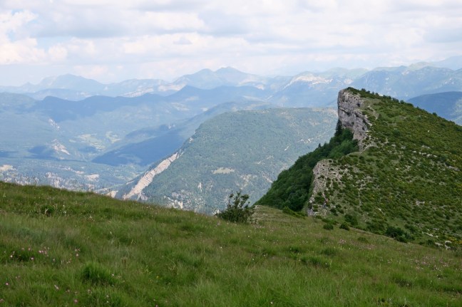 Tout d’abord une ascension tranquille à l’intérieur de la forêt nous a conduit sur de belles prairies, fleuries à souhait et à la sortie d’une haie de genêts nous sommes arrivés sur les prairies habituelles à ces altitudes, et nous avons pu contempler les paysages limitrophes de la Drôme et des Hautes-Alpes, où la Drôme prend sa source. Nous avons longé la crête jusqu’au point choisi pour notre repas. De là, vue superbe sur la vallée de la Drôme et le Diois.