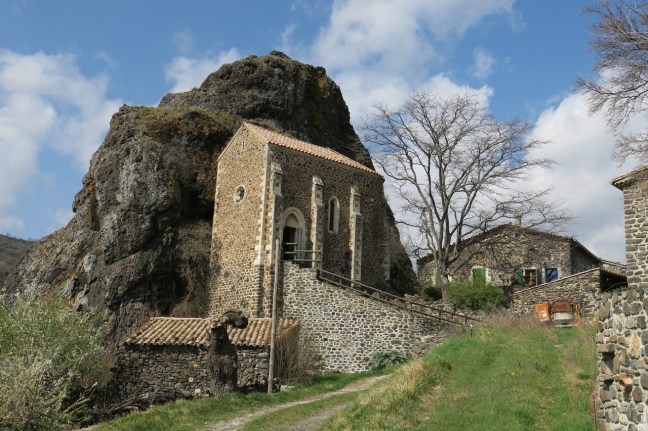 Ensuite le chemin descend, parfois un peu raide, et nous nous retrouvons à la Roche Chérie, chapelle reconstruite dans la seconde moitié du XIXè siècle pour lutter contre le phylloxéra. Elle est adossée à un neck (relief volcanique en forme de pointe correspondant à une ancienne cheminée volcanique). A partir de là, nous empruntons une petite route qui descend vers notre point de départ à Saint-Pons.