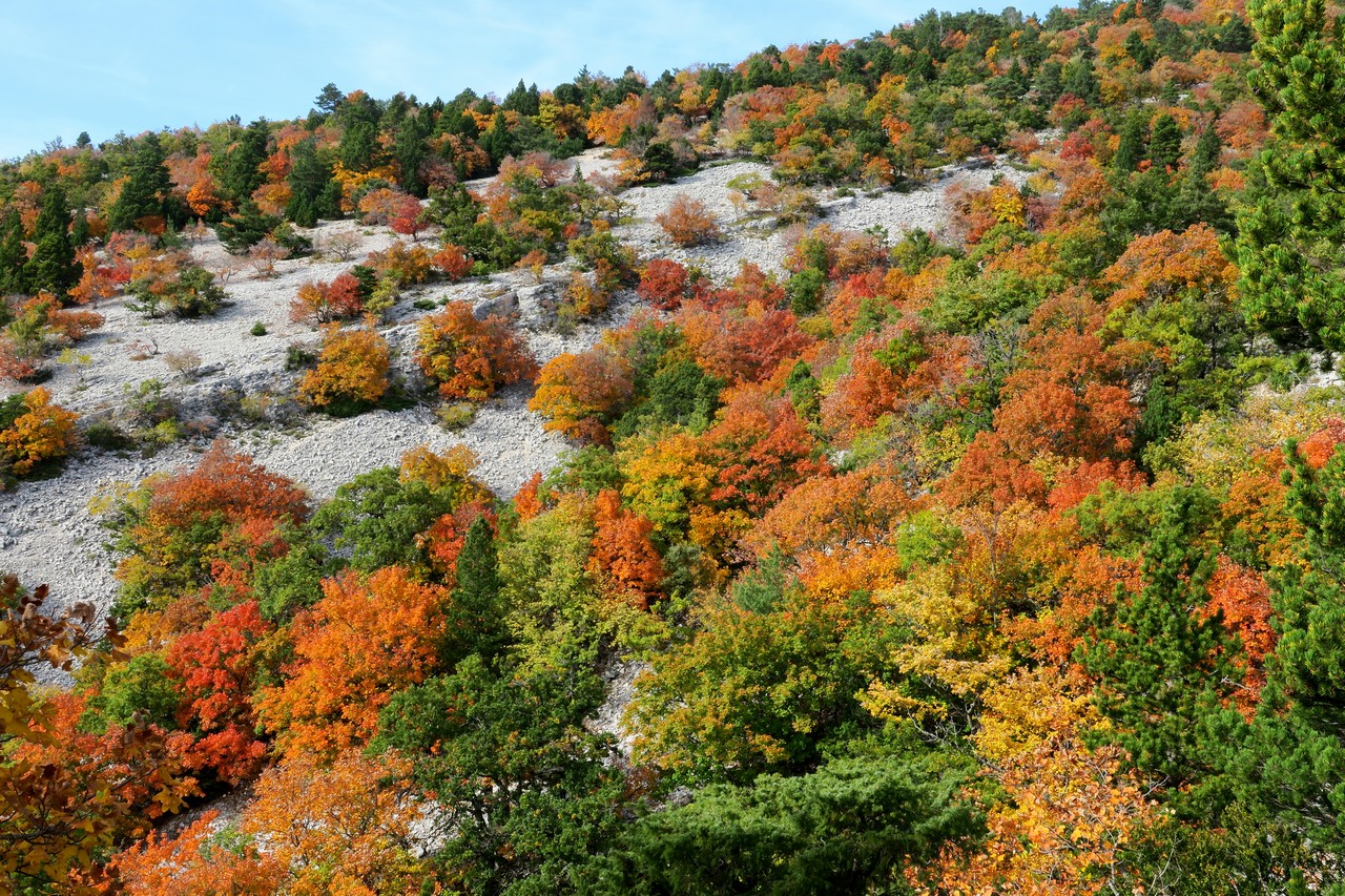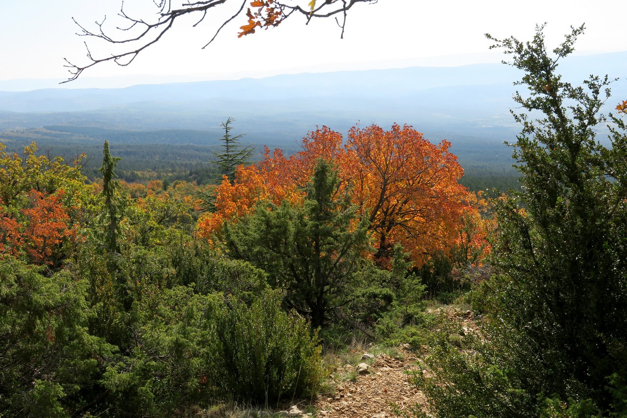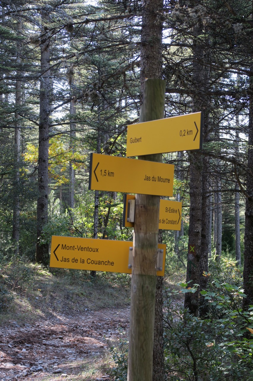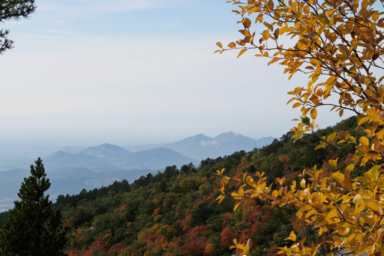 Nous voilà donc partis des Febriers, un hameau de la commune de Bédoin, pour attaquer les quelques 900 m. de dénivelé promis. Le temps était au beau et juste une petite brise, idéal pour grimper dans la verdure des sous-bois qui au fur et à mesure de notre ascension présentait des couleurs d’automne.