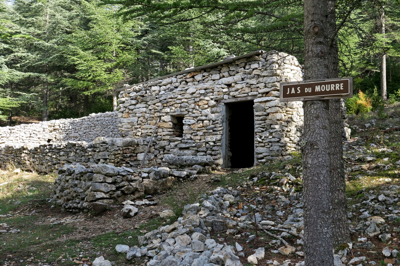 Cela nous conduit au premier jas, le Jas du Mourre, belle bâtisse avec un grand parc pour le troupeau. Il semble en bon état sûrement car il est utilisé par les randonneurs de passage en quête de gîte. Nous poursuivons le sentier pour arriver au Jas de la Couanche, dans une grande prairie et utilisé comme lieu de pique nique par des groupes de passage. Puis nous continuons vers le point (presque) culminant de notre parcours, le Jas du Tomple (ou Toumple en provençal) où nous prenons notre pause habituelle, avec vue sur le sommet.