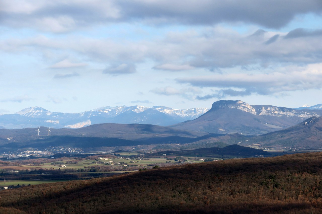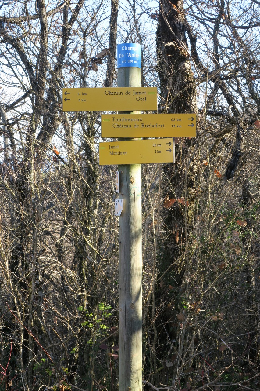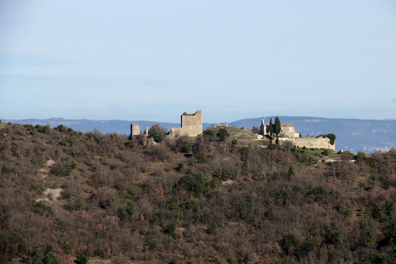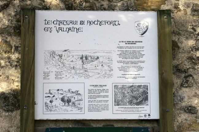 Nous sommes partis à l’assaut du Château de Rochefort à partir d’Espeluche. Le beau temps était de la partie et nous nous sommes enfoncés dans les sous-bois. Les chemins étaient un peu humides mais pas très pentus. Nous avons contourné le château sous la garde des éoliennes qui ne manquent pas de se multiplier sur ces collines très ventées. Nous sommes arrivés à la bonne heure dans la cour du château et avons pu sortir notre pique-nique en profitant du soleil.