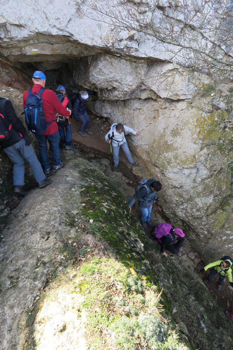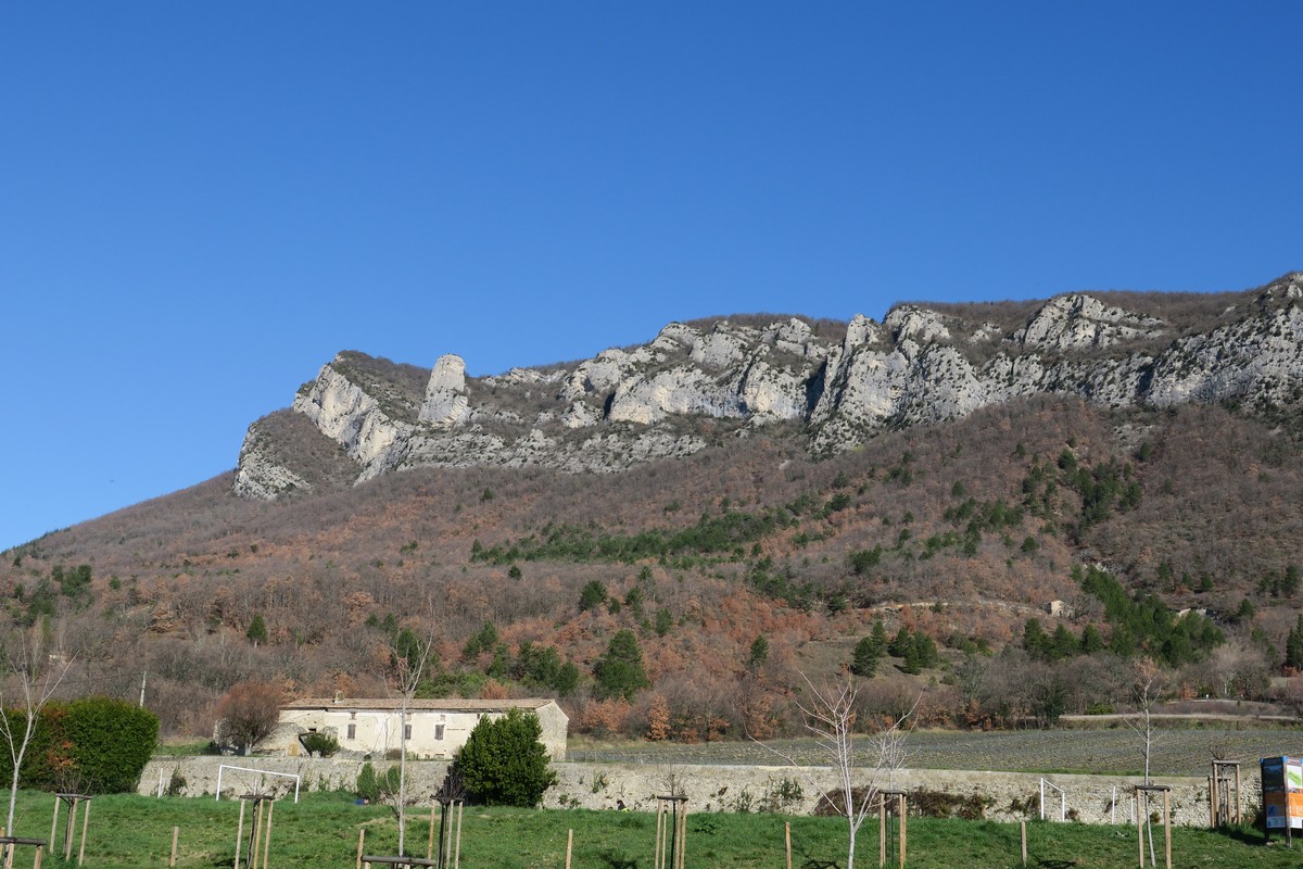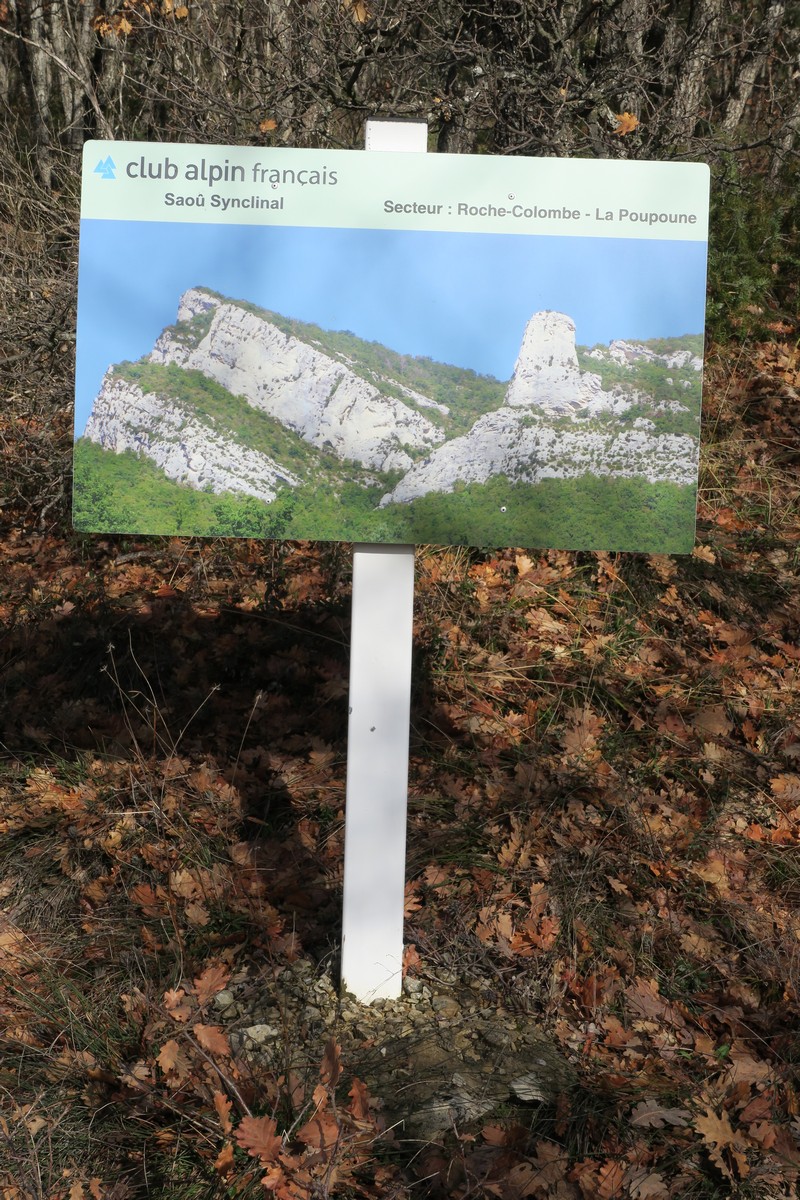Nous sommes partis de Nyons sous un ciel mitigé, mais en arrivant à Saou un ciel bleu nous attendait et le soleil brillait. Nous sommes donc montés à l’assaut de la face ouest du synclinal de Saou sur le sentier qui s’élève assez rapidement à travers les sous-bois, au pied des falaises abritant plusieurs sites d’escalade. Puis passage sous la Poupoune avant d’attaquer la montée qui nous conduit vers la crête.