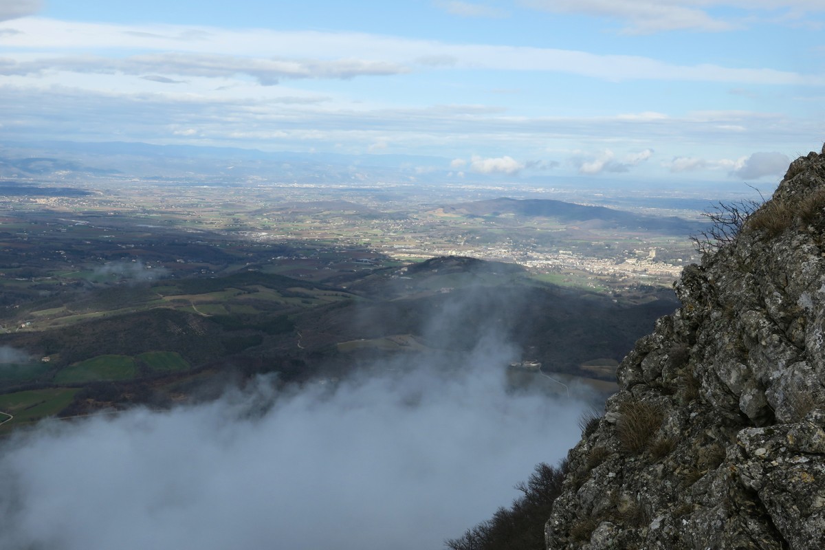 Au fur et à mesure de la montée les nuages, poussés par un vent du sud-ouest, gravissent eux aussi les falaises. Nous suivons la crête en essayant d’apercevoir les vallées du Rhône et de la Drôme que les nuages nous laissent entrevoir de temps en temps. Mais nous n’aurons pas la chance d’apercevoir les 3 Becs.