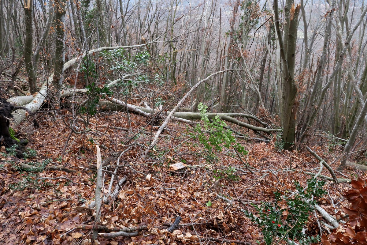 La descente se poursuit par un passage quelque peu acrobatique avant de continuer à travers la forêt où nous pouvons constater les dégâts causés par la tempête. De nombreux arbres tombés à terre, certains sur le sentier, nous permettent de réaliser quelques figures acrobatiques avant de retrouver un terrain plus tranquille.
