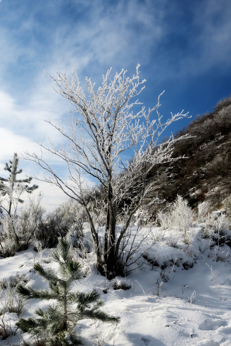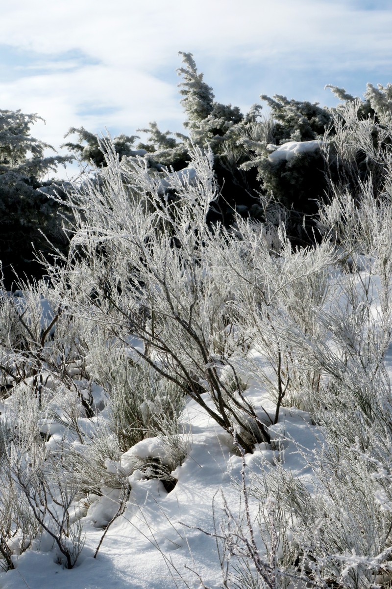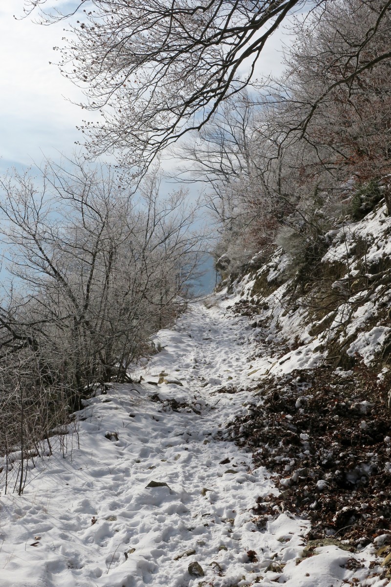 Au col Renard, un épais manteau de neige recouvrait le sol et les arbres étaient givrés en ce milieu de matinée ; expérience unique et magnifique. Par une piste enneigée, nous descendons vers le col situé au pied du Vautour.