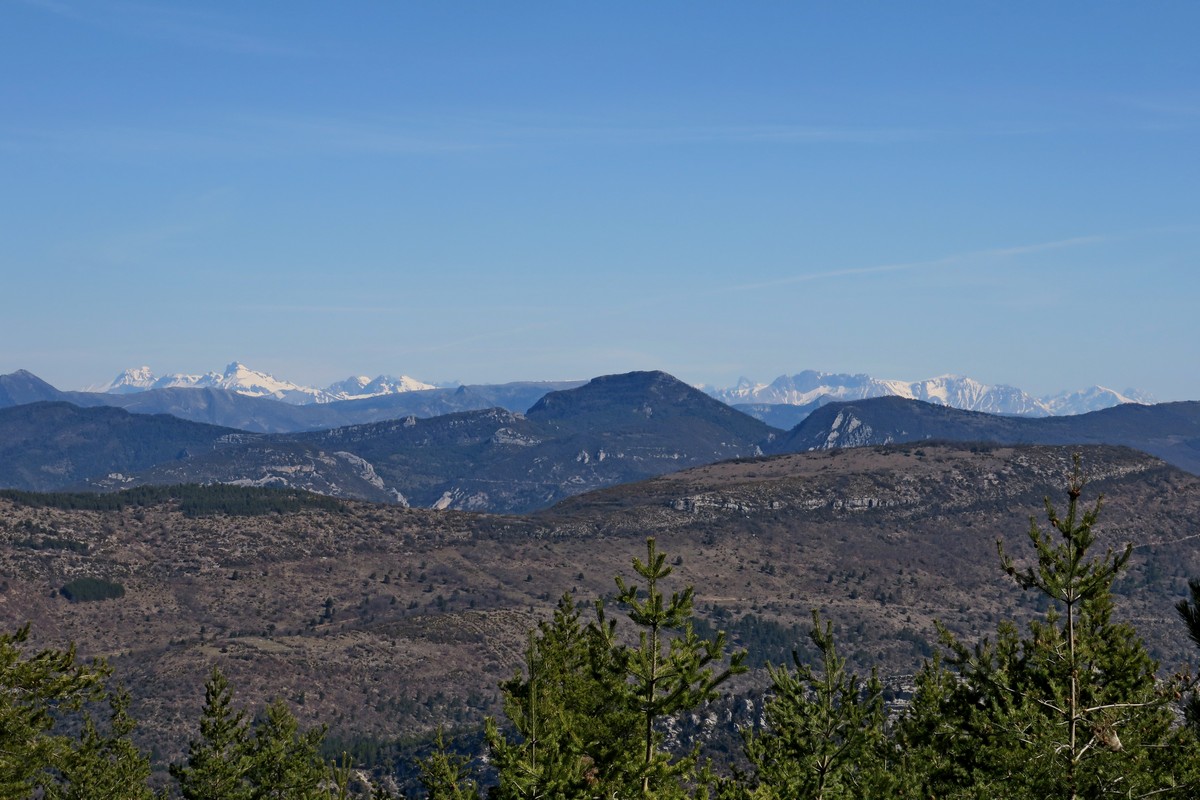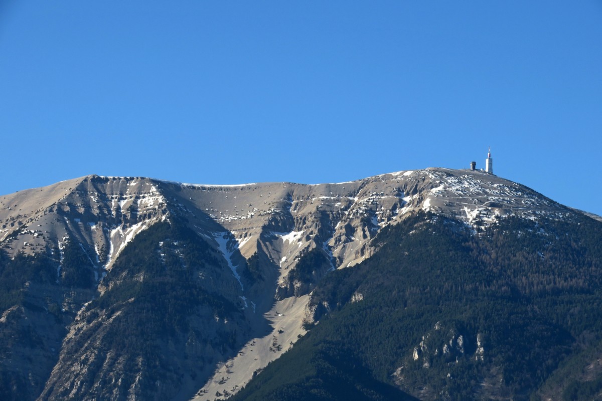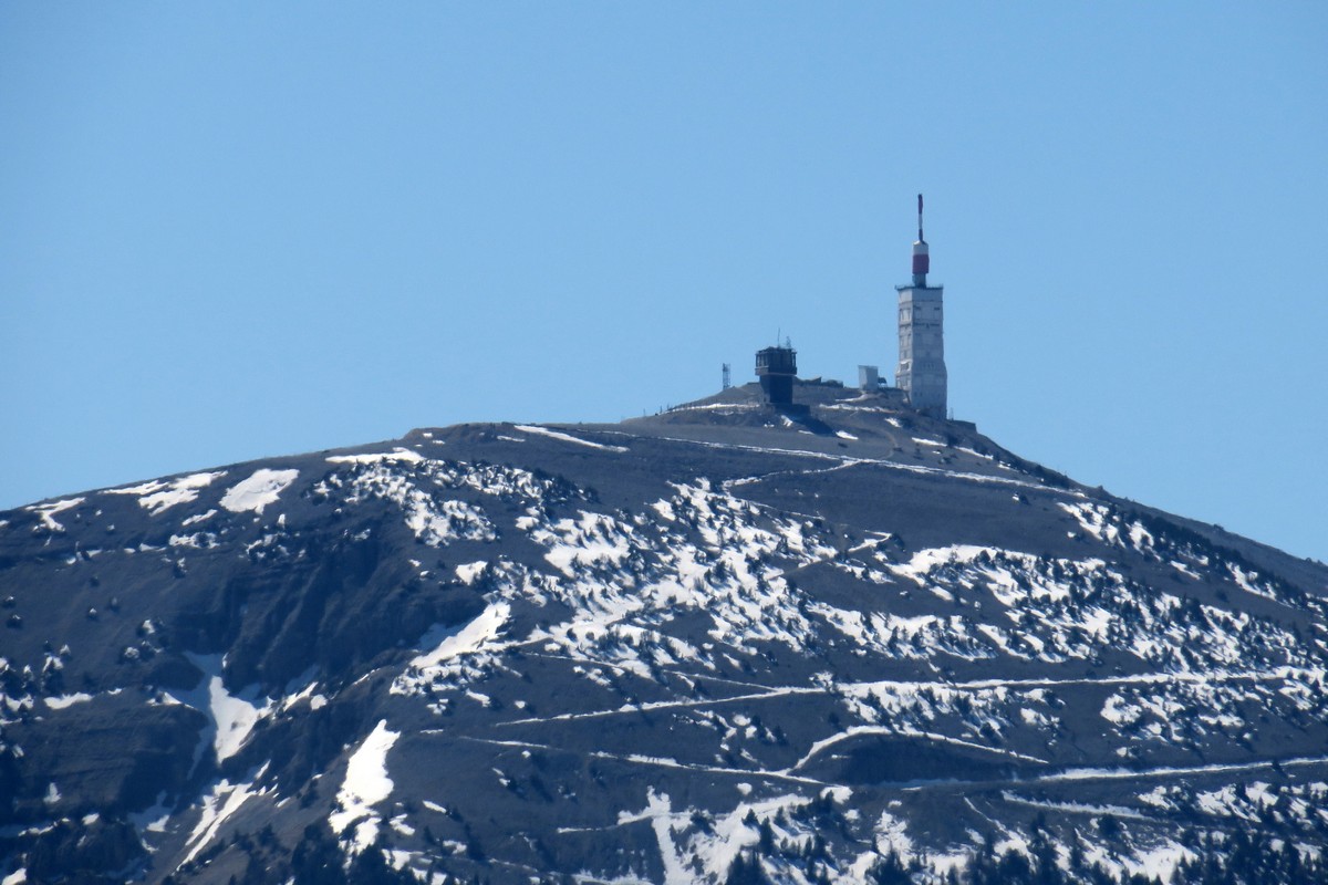 Tout au long de la montée nous avions dans le dos l’imposante masse du Ventoux qui semblait tout proche, avec encore quelques traces de neige aux alentours du sommet. Plus haut, nous avons commencé à apercevoir les sommets du sud