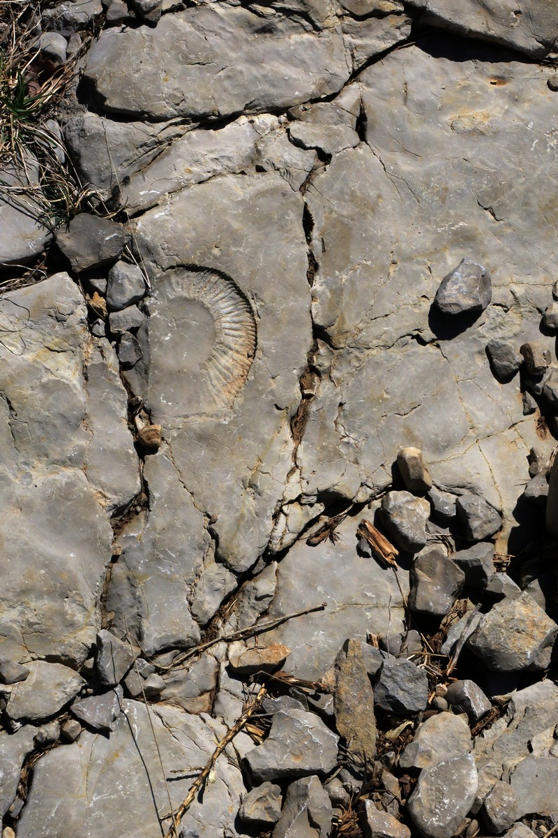 Un peu plus loin le sentier, en arrivant au point culminant de notre marche à 1100m, nous offrait une vue imprenable sur le Dévoluy : l’Obiou, le plateau de Bure. Après un repos bien mérité face à ce spectacle, il a bien fallu repartir pour aller retrouver nos véhicules. Sur le chemin nous avons rencontré un certain nombre de fossiles (des ammonites) avant de prendre un chemin plus pentu, très caillouteux. Après un bonne descente, nous avons retrouvé le hameau des Girards où les chiens nous ont salué pour notre retour.