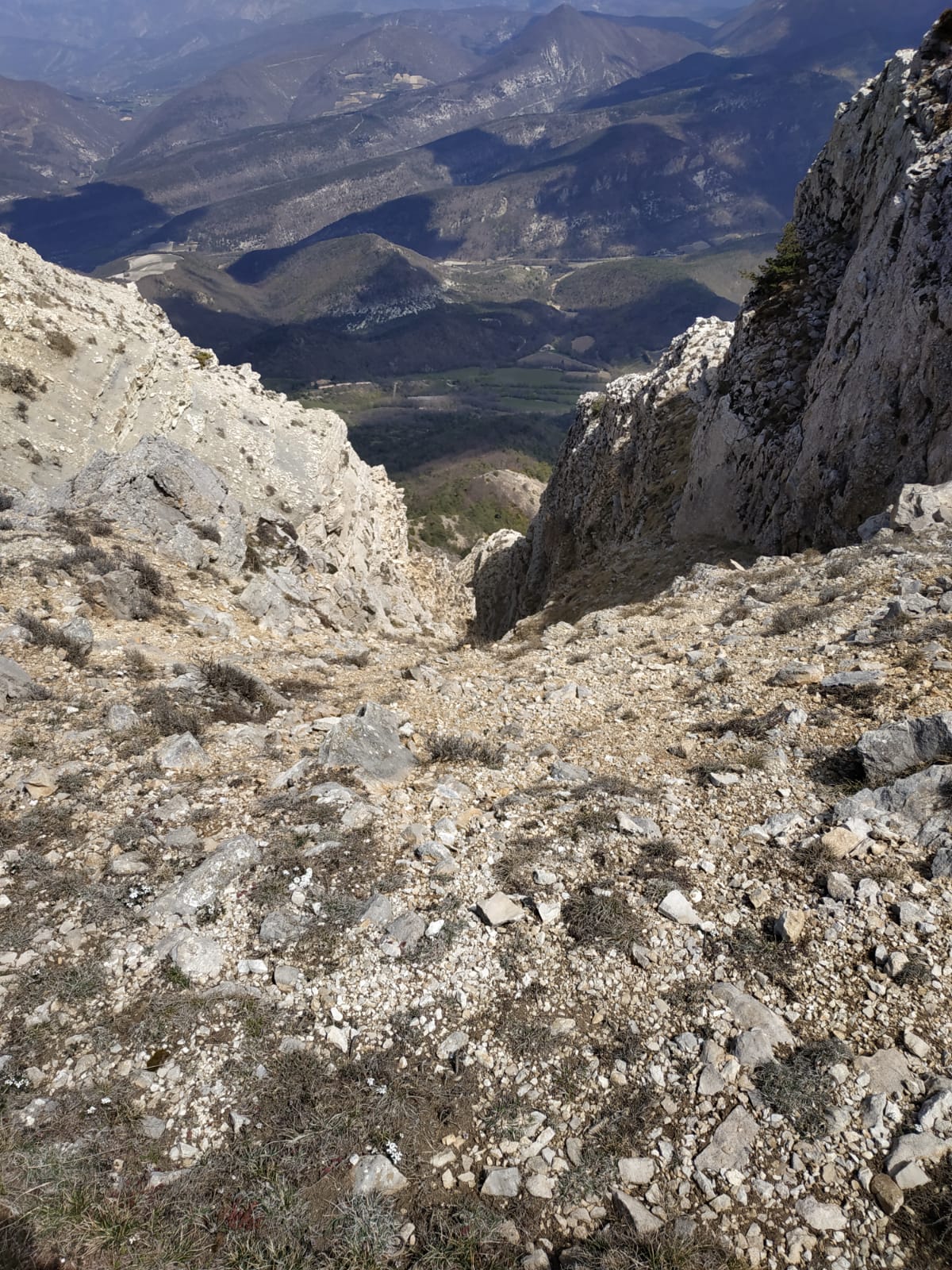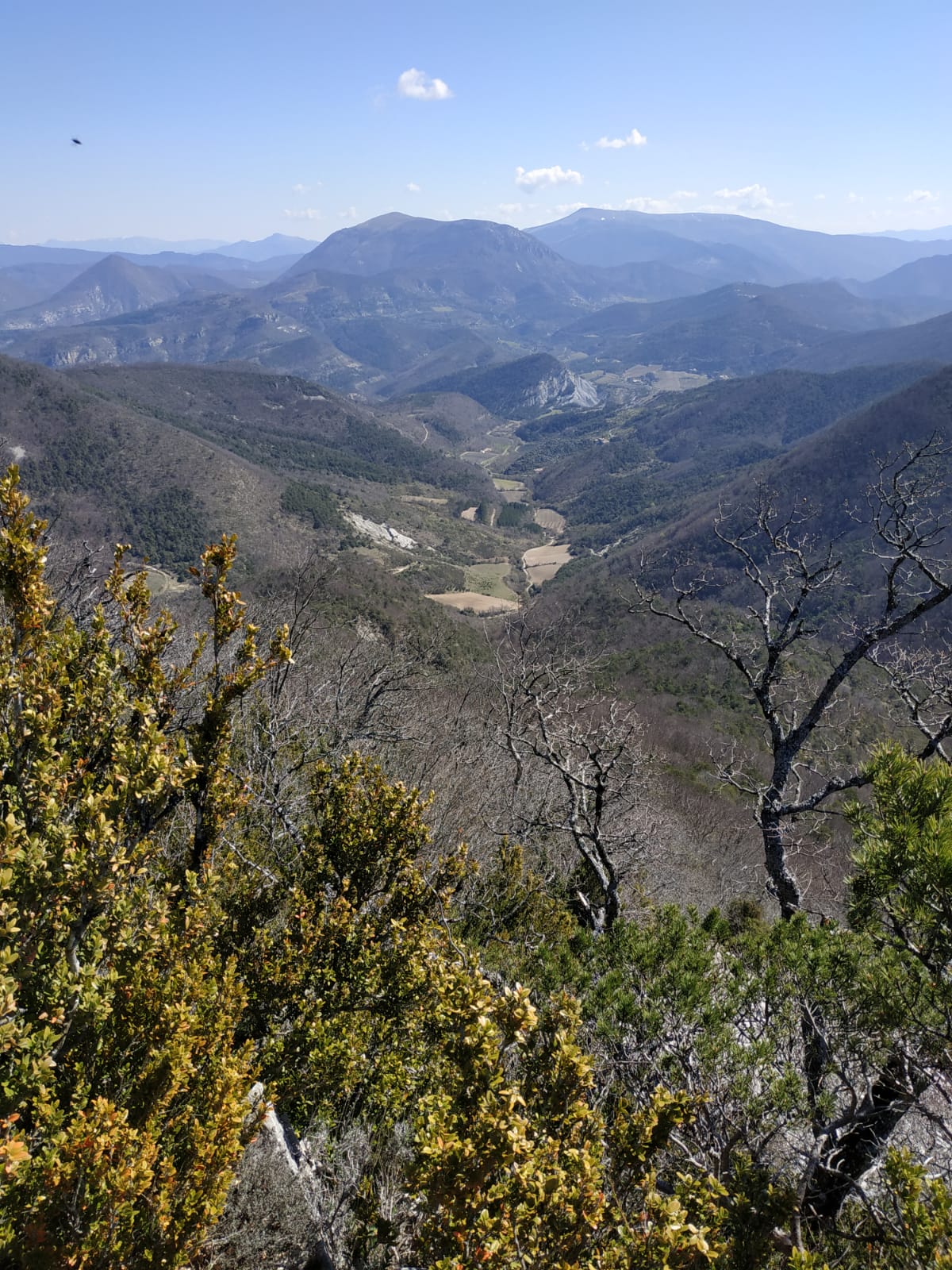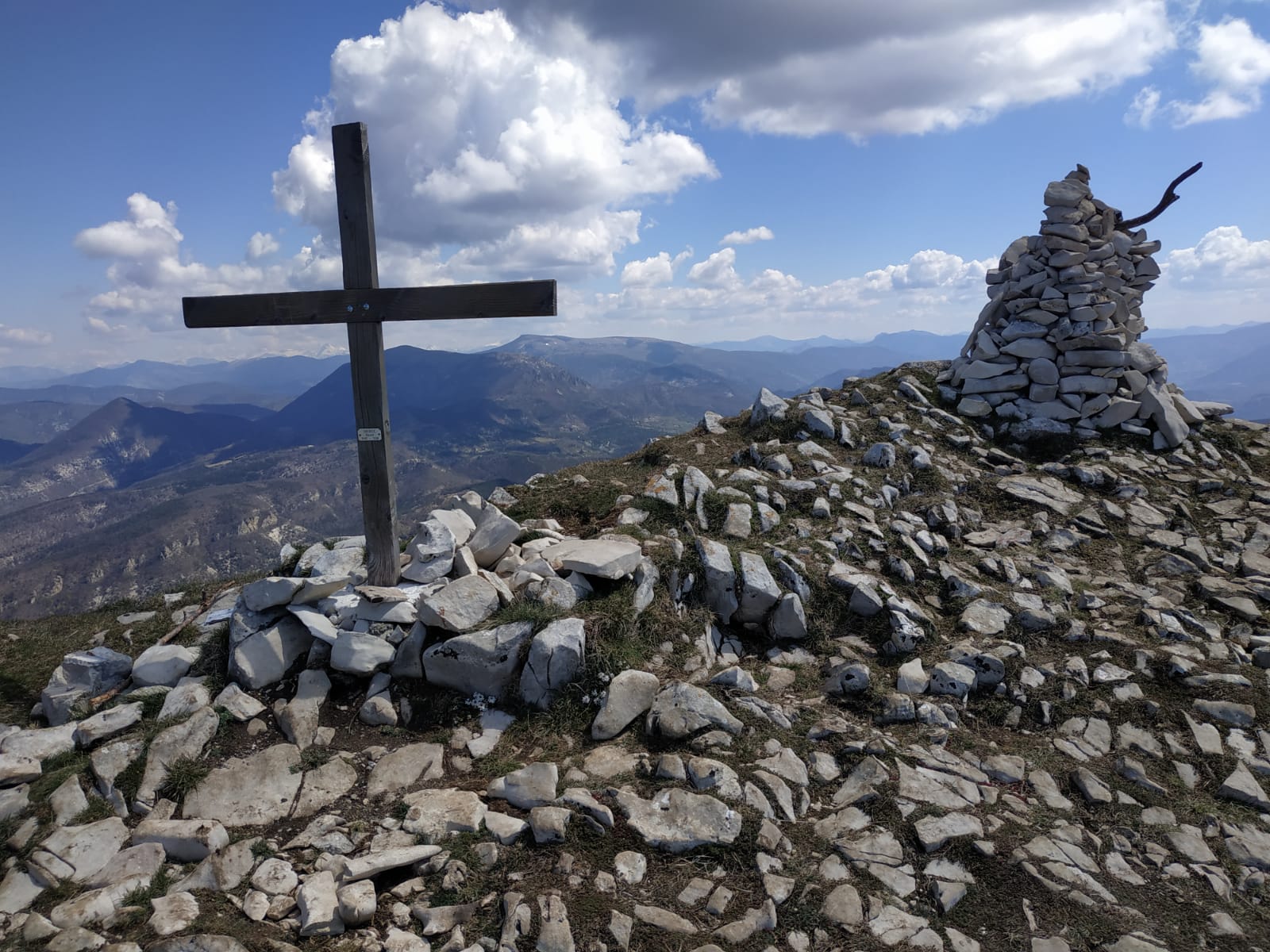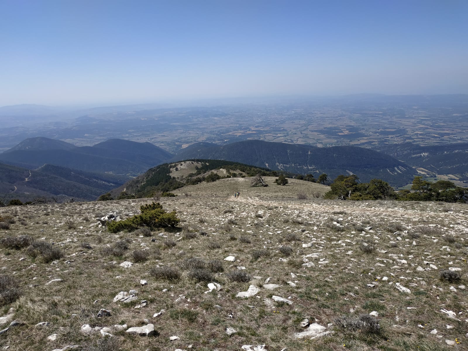 Nous nous répartissons alors le matériel (outils de coupe et peintures blanche et rouge) et partons pour le sommet. Nous prenons aussi le temps de regarder les paysages qui s’étalent sous nos yeux, de la plaine du Rhône au Ventoux , puis des trois Becs au Dévoluy.