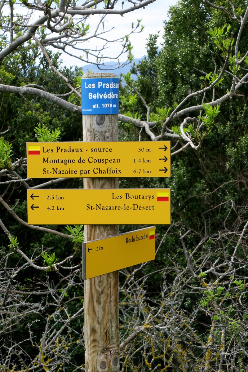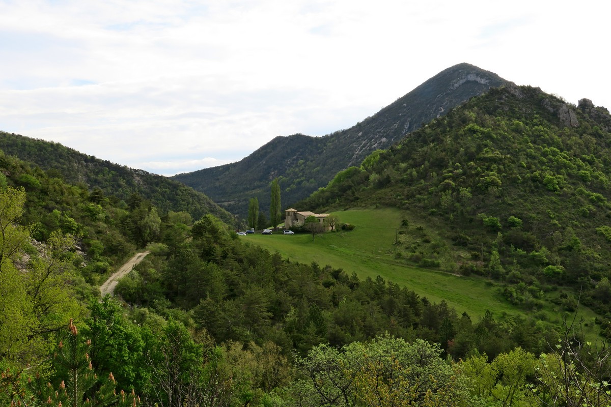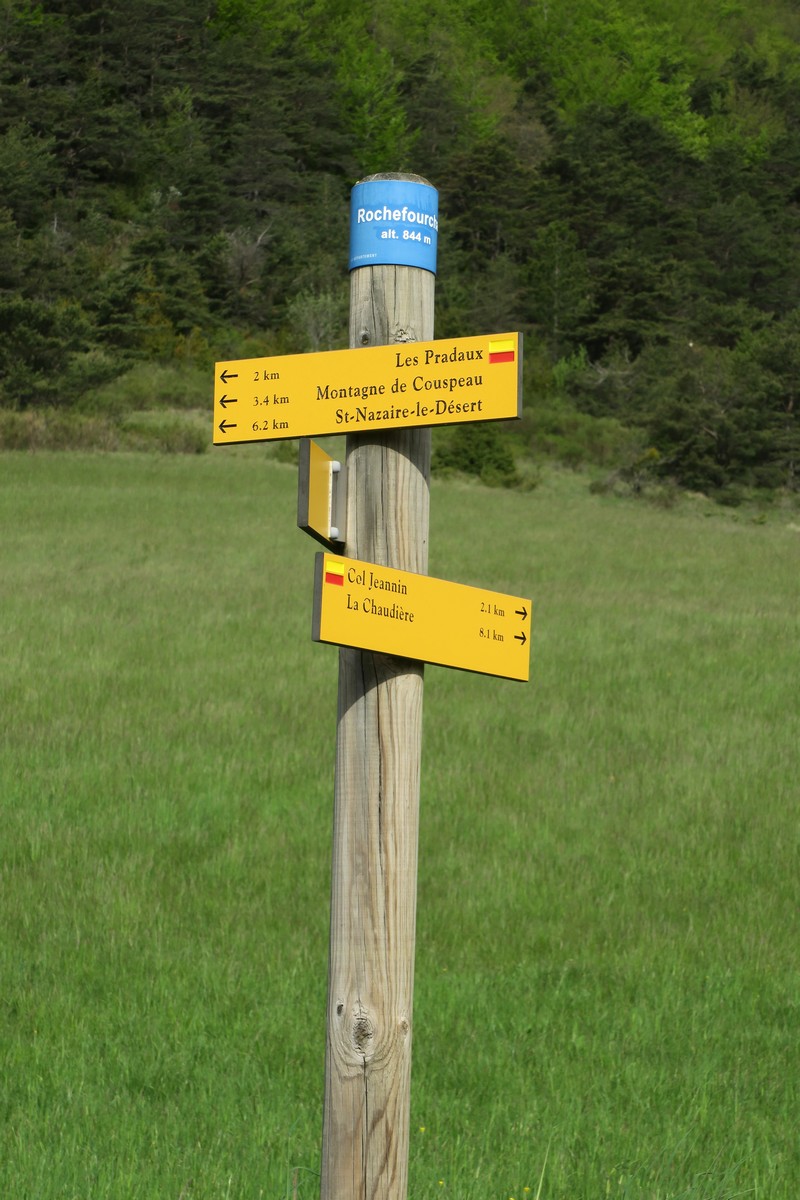 Notre point de départ, ce dimanche, était Rochefourchat, la plus petite commune de la Drôme qui ne compte qu’un habitant. Il n’y a qu’une grande maison et une église dédiée à Saint-Pierre. C’est de là que nous prenons le sentier qui monte sur la montagne de Couspeau. Ce sentier nous conduit à travers des sous-bois jusqu’au hameau abandonné des Pradaux qui était le but d’une randonnée en 2019.