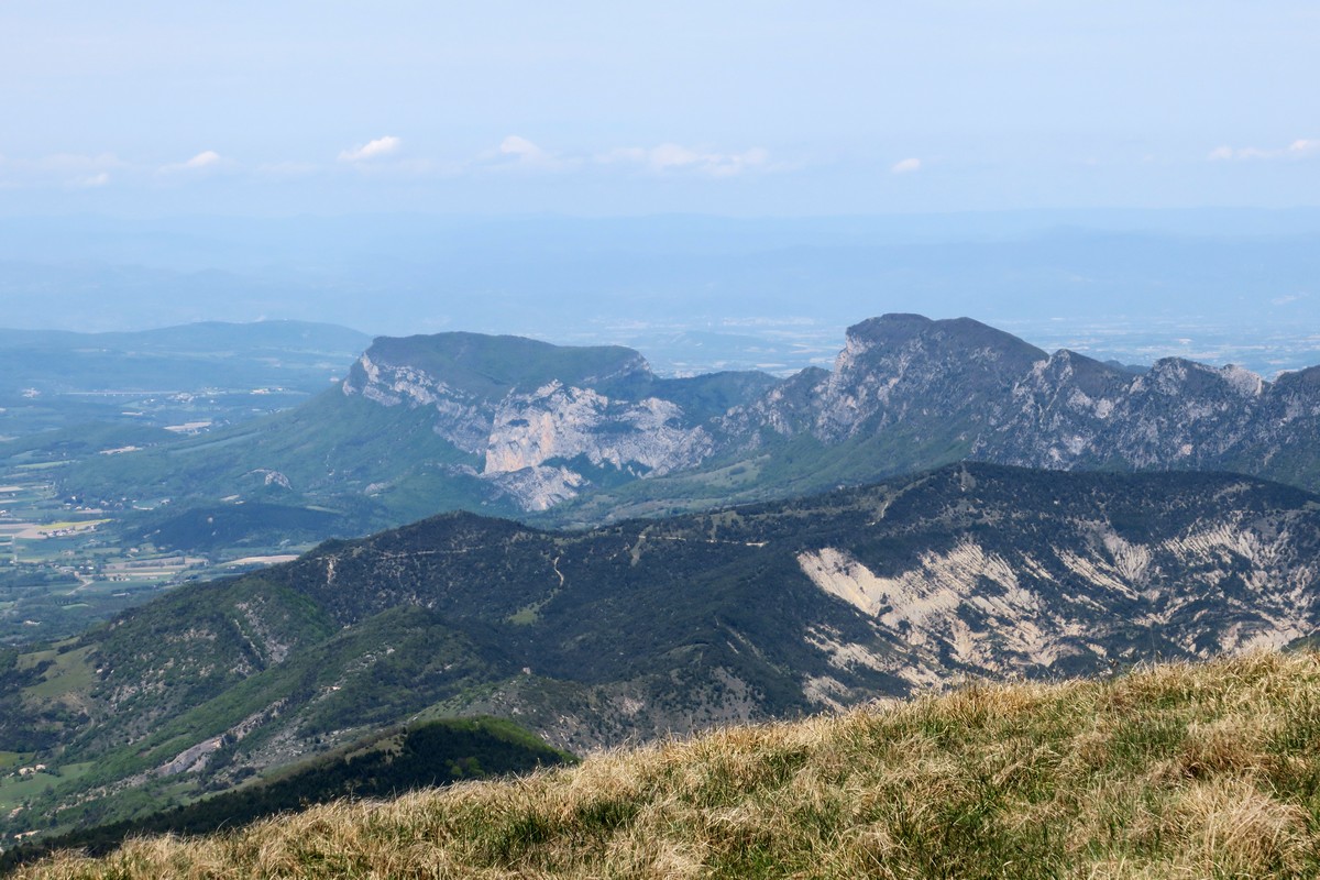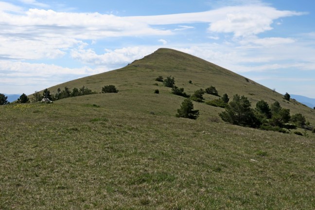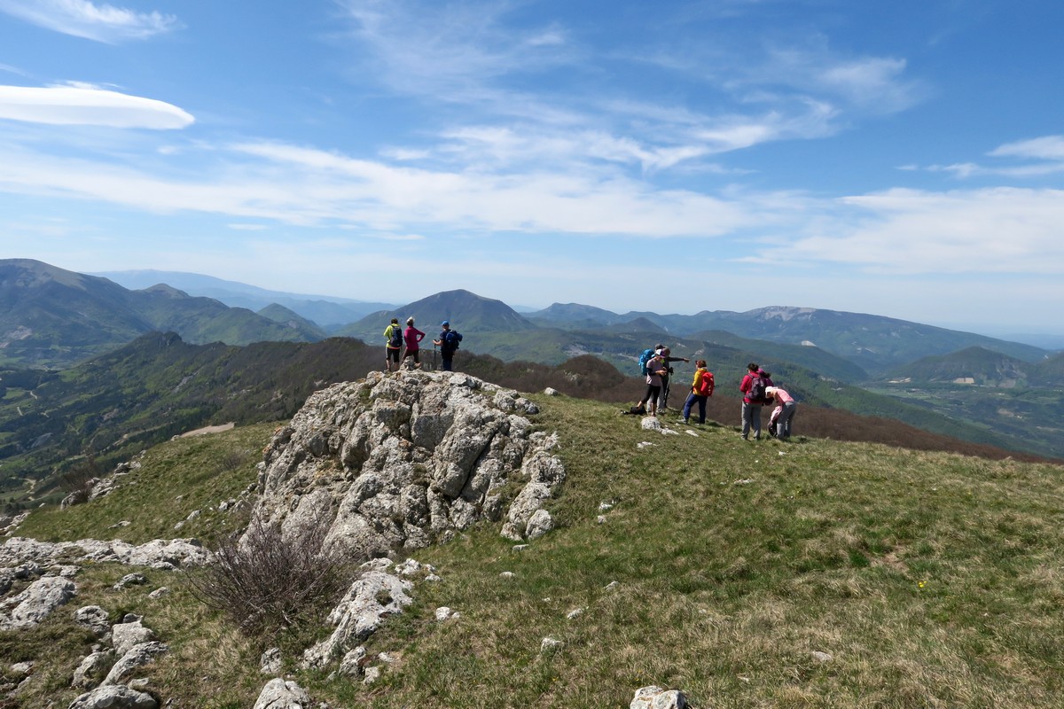 A partir de là, la pente prend quelques degrés supplémentaires puisqu’il nous faut passer de 1075m. pour arriver sur le crête à 1427m. sur une distance de 1,5km. Mais nos efforts sont récompensés par la vue qui s’offre à nous une fois arrivés sur crête. La-haut nous somme accueillis par un fort vent du sud et avec des bourrasques qui nous bousculent un peu. Nous faisons un petit aller-retour sur le Serre Delègue 60m. plus haut pour avoir une vue imprenable sur le sud, avec le Ventoux, la montagne d’Angèle, Miélandre, le Cougoir, la Lance et autres sommets que nous connaissons bien. Puis nous repartons pour parcourir Couspeau vers le Grand Delmas qui nous attend au loin.