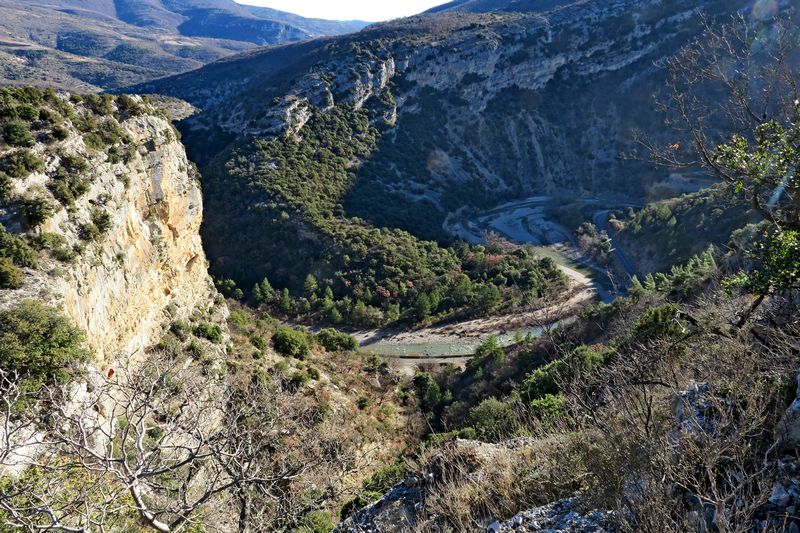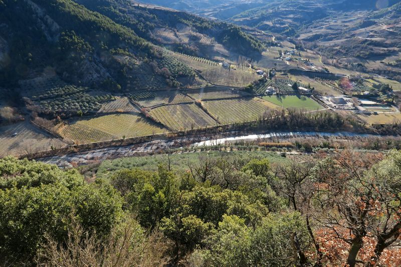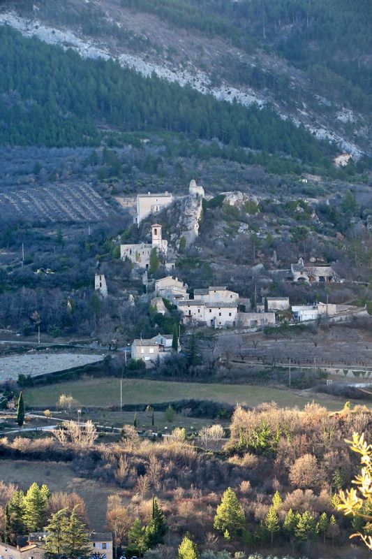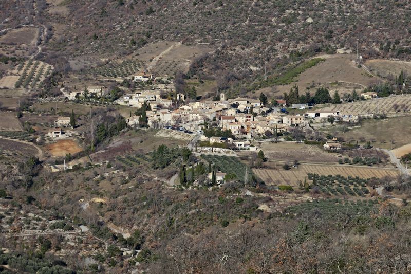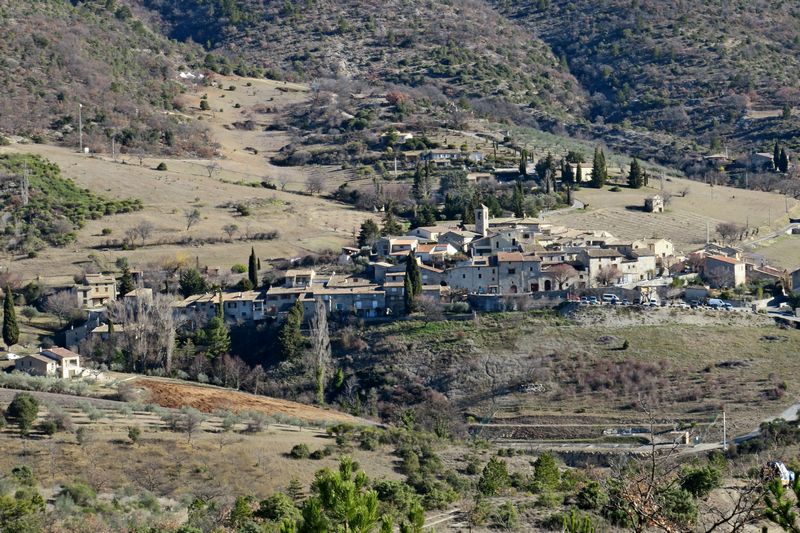Notre itinéraire nous conduit ensuite sur le Serre de la Baye et nous apercevons pour la première fois le village de Villeperdrix dans son bassin synclinal au pied de la Montagne d’Angèle. Nous quittons le GRP pour nous diriger vers le village que nous ne faisons que traverser pour continuer, à travers les jardins et champs d’oliviers déjà cultivée par les romains, vers les Vieilles Banquettes et nous profitons de la vue plongeante sur l’Eygue.