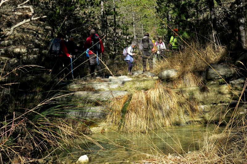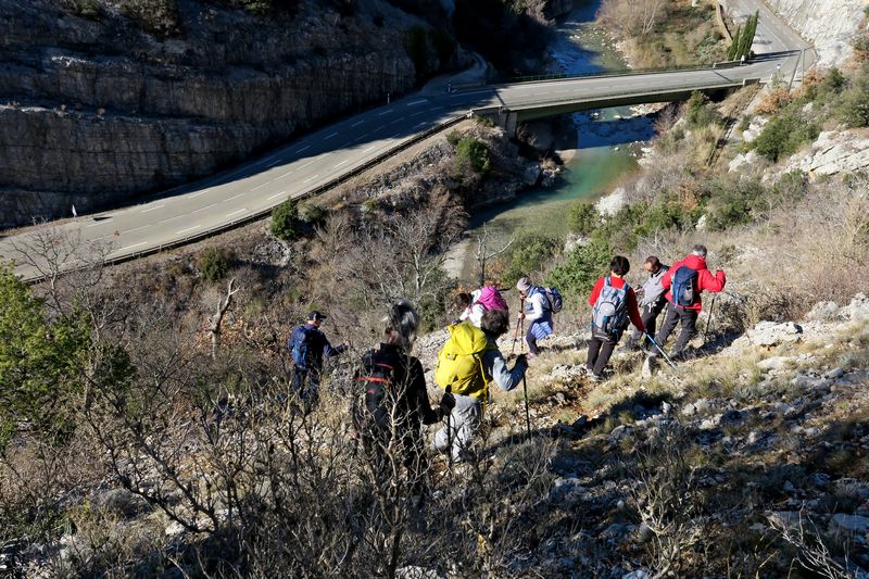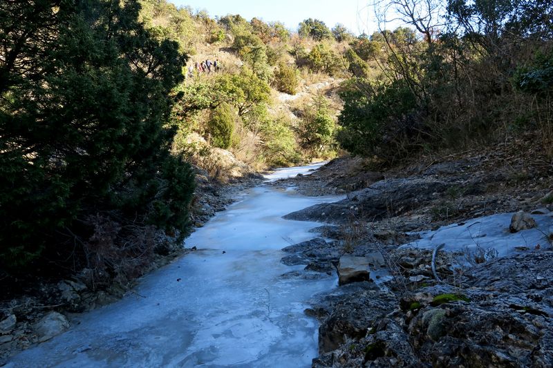 Nous étions 12 au départ de Sahune pour attaquer notre randonnée. Tout d’abord la montée sur les pentes du Marcel, au milieu de champs d’oliviers, qui nous a permis de profiter de la vue sur la vallée de l’Eygue, le vieux village de Sahune, la montagne du Buisseron et le Bramard. Un peu plus haut nous quittons le sentier du Marcel pour nous diriger à droite, sur le GRP du Tour des Baronnies Provençales en direction de Villeperdrix. Sur un replat boisé nous un sentier qui descend entre chênes et buis et qui débouche sur un ravin pour traverser le ruisseau du Grand Ubac et nous montons vers la crête du Partiment qui nous donne l’occasion de surplomber les Gorges de Saint May et nous redescendons jusqu’à traverser un petit ruisseau encore gelé jusqu’à la pause banane à la maison forestière.