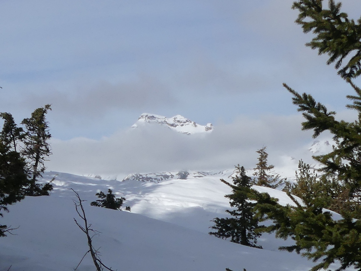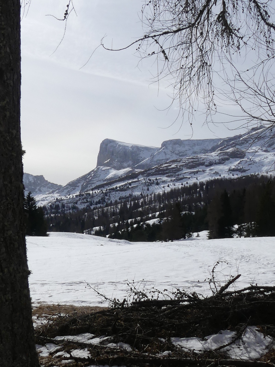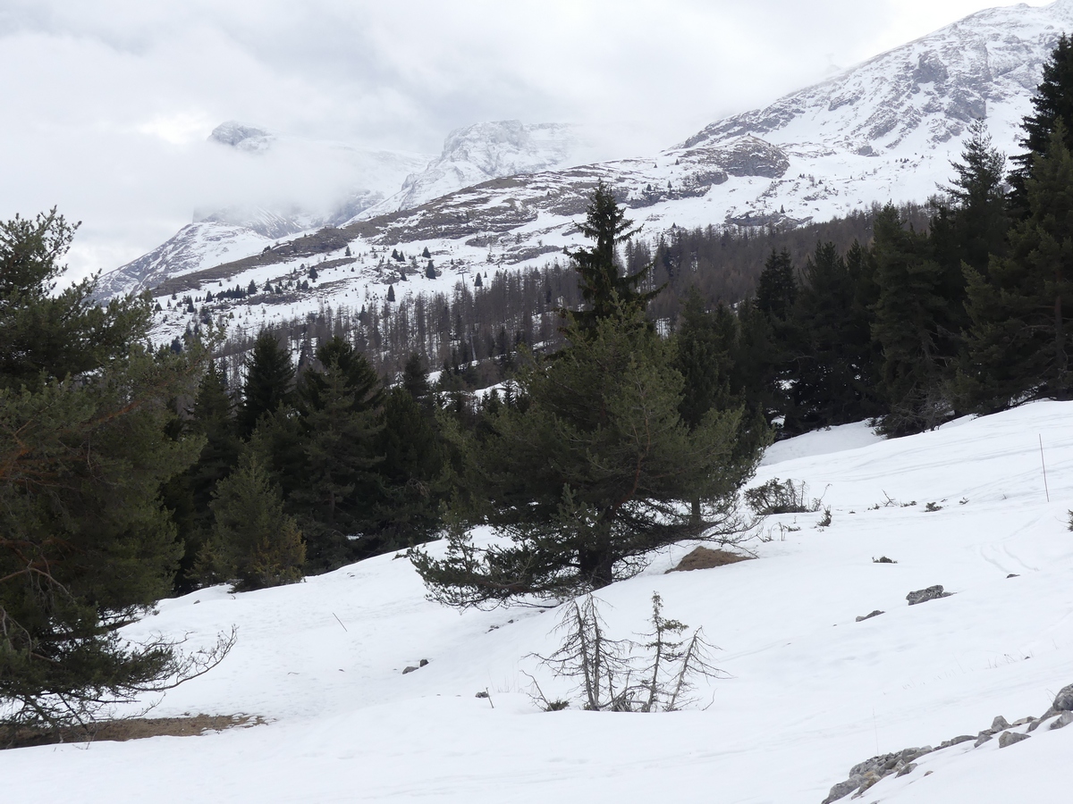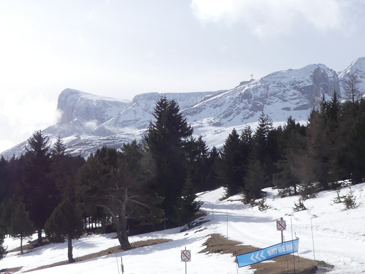 Nous arrivons au Collet du Tât pour une petite pause et découvrons face à nous le Pic de Bure (2709m). De l’autre côté, l’Obiou et le Grand Ferrand sont dans les nuages. Nous descendons tranquillement jusqu’à Super Dévoluy. La neige fait par endroits place à la terre.