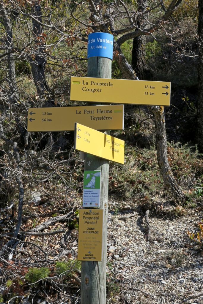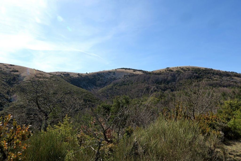 Par un petit chemin non balisé, qui contourne une grande propriété privée, nous retrouvons le GR de Pays Tour du Pays de Dieulefit. Du Collet de la Lionne nous avons une vue magnifique sur la face est de la Lance. Peu après le col de la Pause, nous descendons vers le Col de Venterol qui domine la Combe de Sauve. Au passage un beau troupeau de chèvres aux cornes torsadées attire notre regard. Le patou nous surveille pendant que les chèvres dégustent avec gourmandise les arbustes piquants.