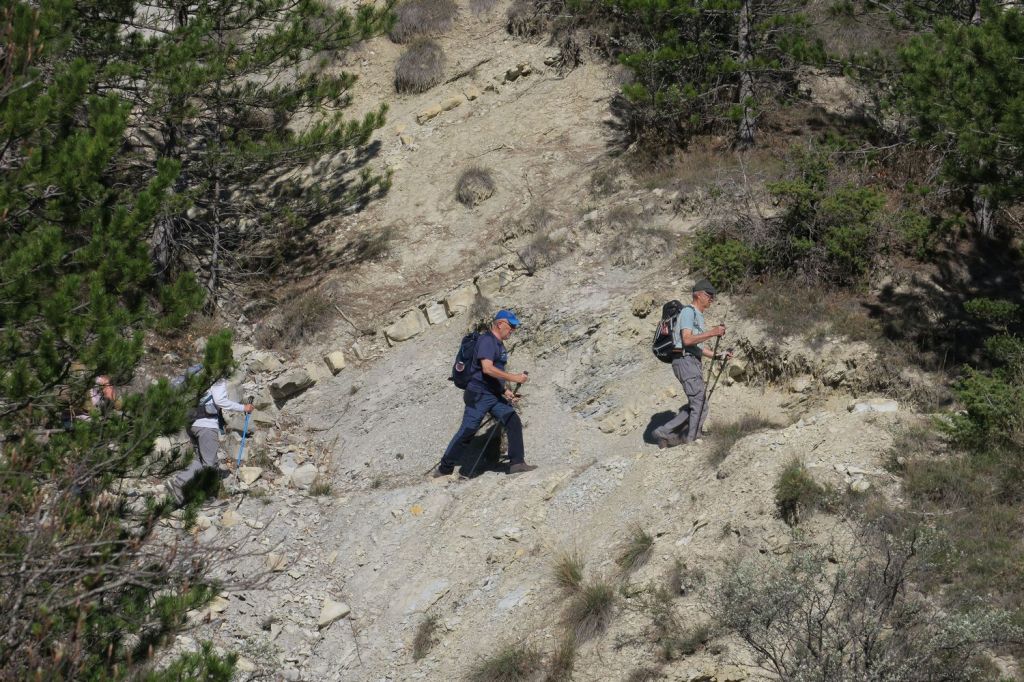 Nous nous garons à Villeperdrix, et prenons le GRP du Tour des Baronnies en direction du col de Chaudebonne. Nous longeons quelques jardins et très vite arrivons dans la garrigue, sur un terrain marneux couvert d’une maigre végétation, essentiellement des genêts scorpions. Les quelques ruisseaux que nous traversons sont tous à sec.