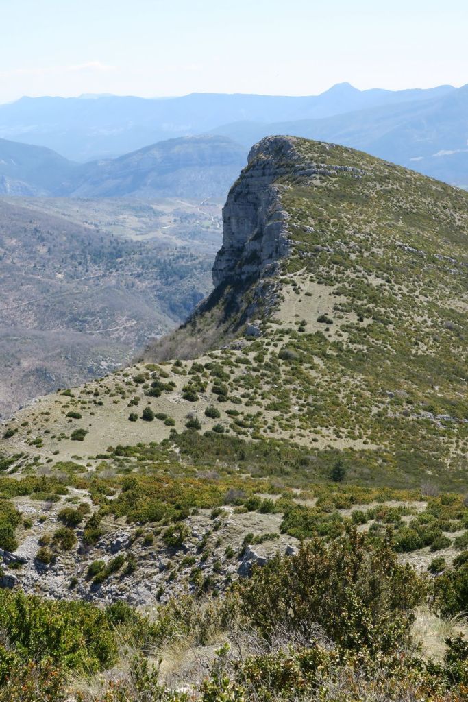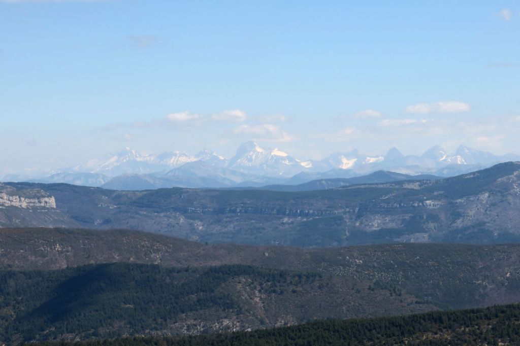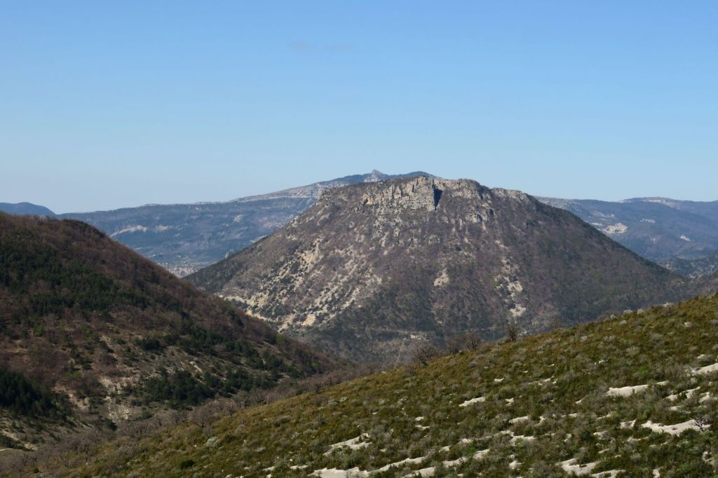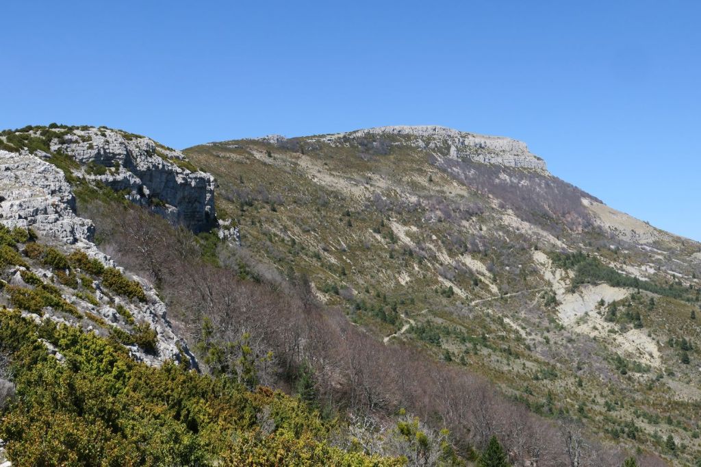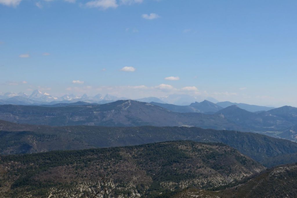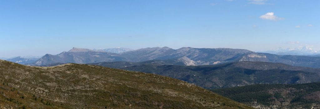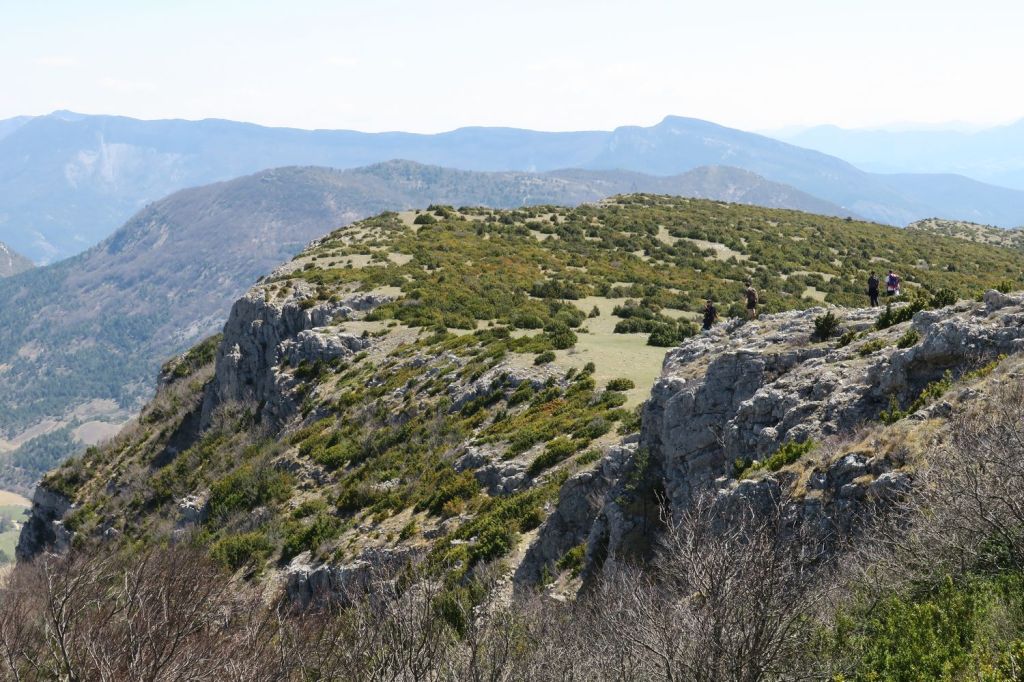 A notre gauche nous apercevons la Lance et Cougoir, à droite la vallée de l’Eygues et les montagnes des hautes Alpes. Puis débute une longue, très longue montée sur le flanc d’Angèle, dans les buis et autres arbustes malingres, toujours sur le GRP, en direction du nord-est. Nous atteignons la crête vers le Pas de l’Essartier (1238 m) peu avant midi. La vue s’ouvre sur pratiquement 360°, seulement bouchée au nord-ouest par la crête qui monte au sommet. Nous nous installons à l’abri pour la pause déjeuner, en surplomb de la vallée du Léoux, face à la Servelle, les montagnes du Diois, le Glandasse et le Dévoluy. Après un petit repos nous poursuivons notre route en descendant la crête vers le sud-est. A notre droite les Baronnies et au fond, le Ventoux.