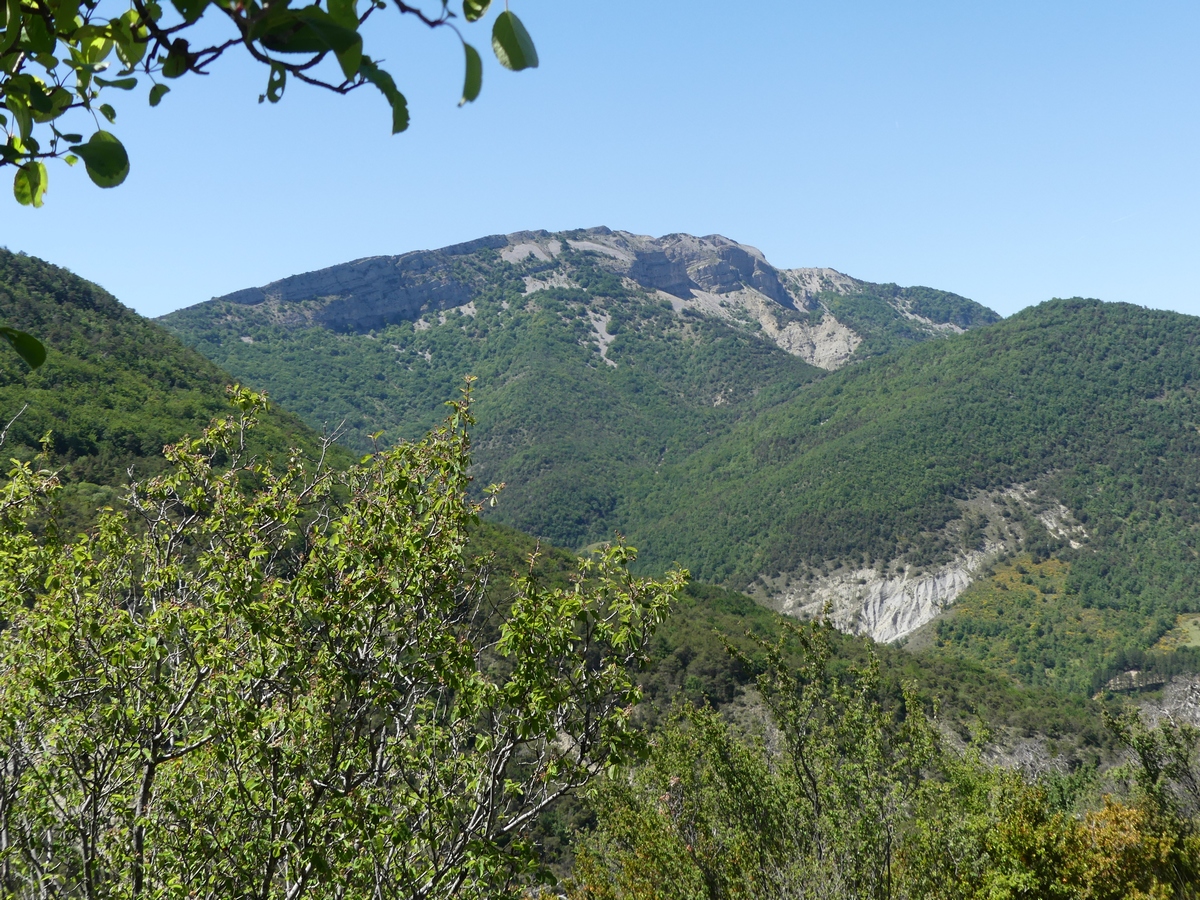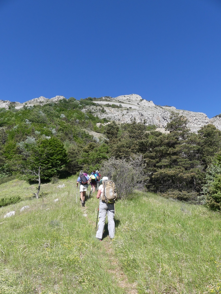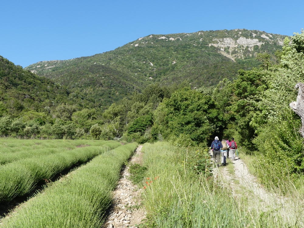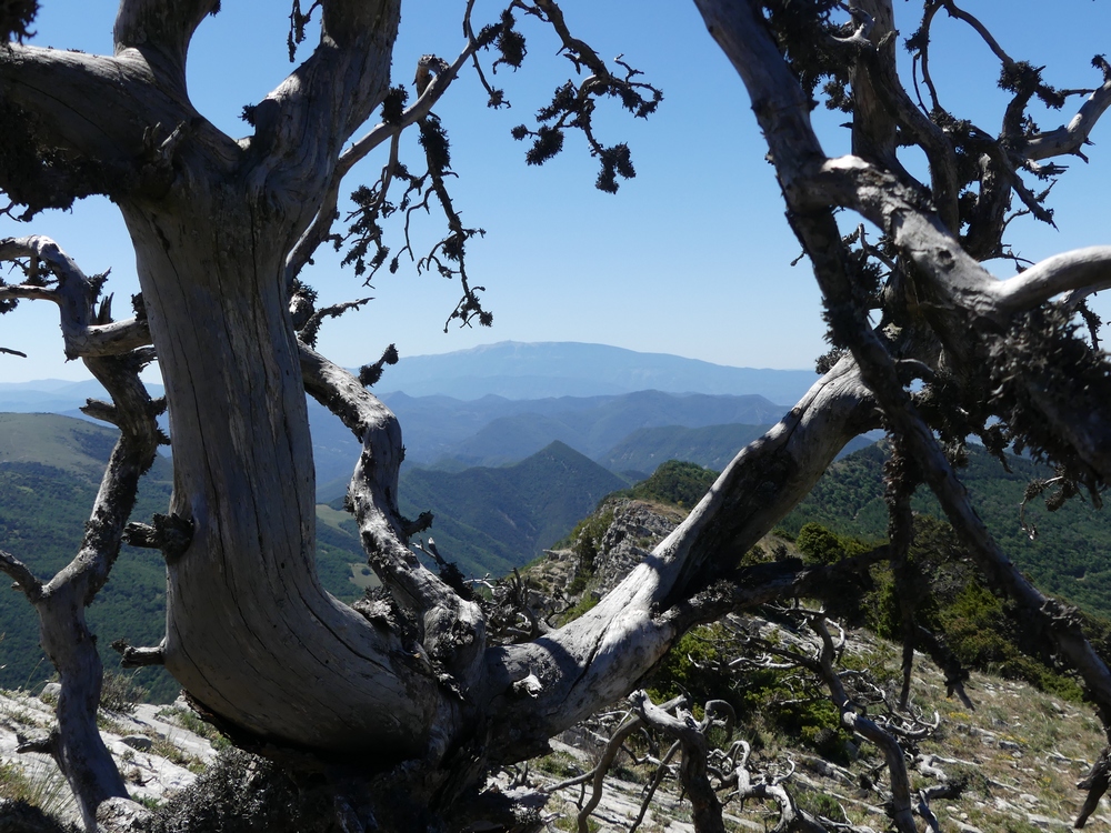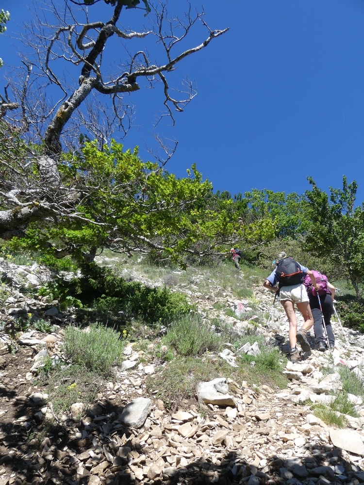 Nous débutons la marche par une piste qui longe lavandes et vignes et qui monte progressivement vers le col du Coucourdet. A droite le dôme boisé du Coucourdet et à gauche, face à nous, la crête rocheuse impressionnante de la Lance. On prend quelques forces avant de s’élancer sur un tout petit chemin sinueux et très pentu qui traverse une zone de magnifiques et gigantesques fayards qui ont pris racines en bas de la falaise. Nous nous arrêtons fréquemment pour contempler les sommets du Ventoux aux Trois Becs en passant par Cougoir, Angèle et Miélandre.