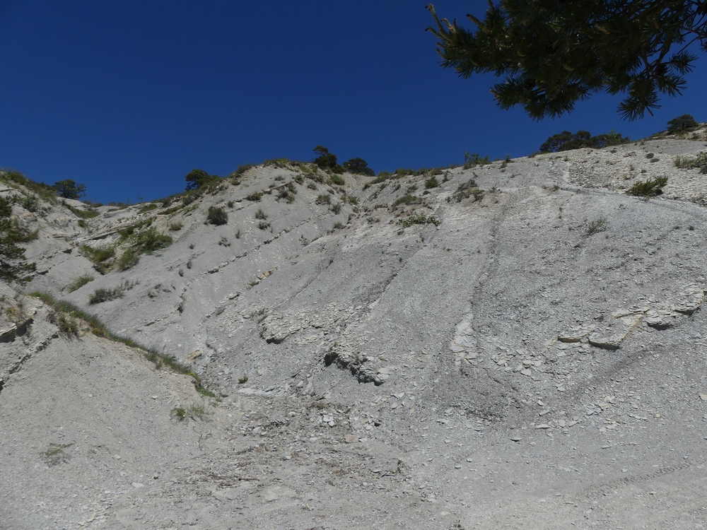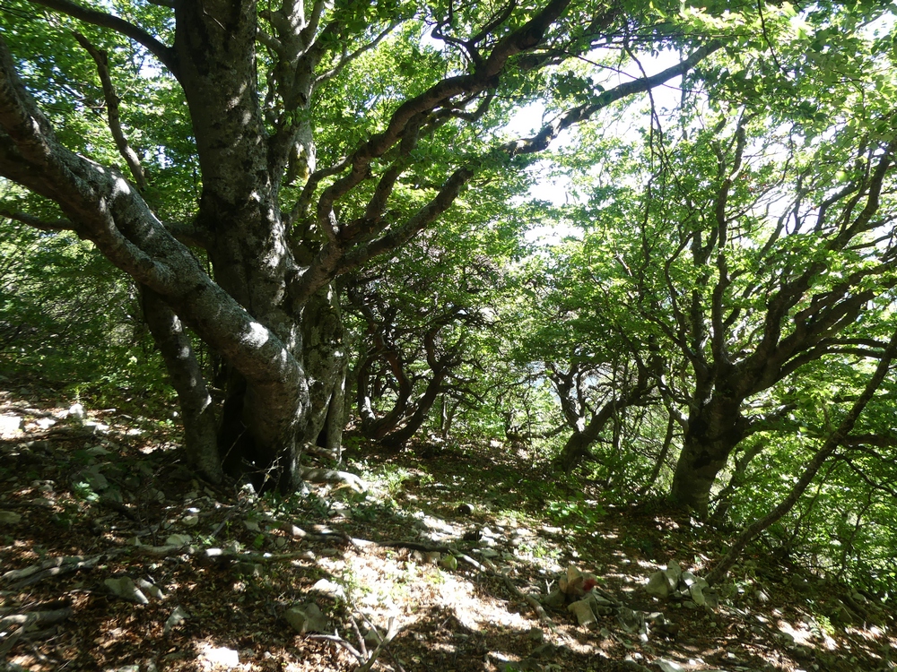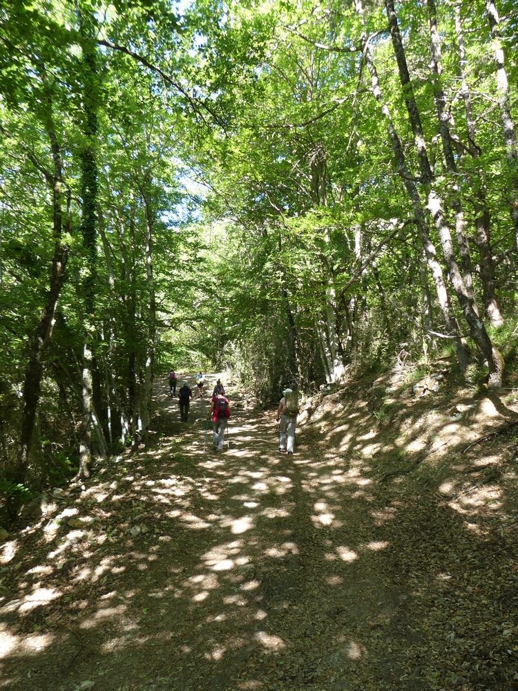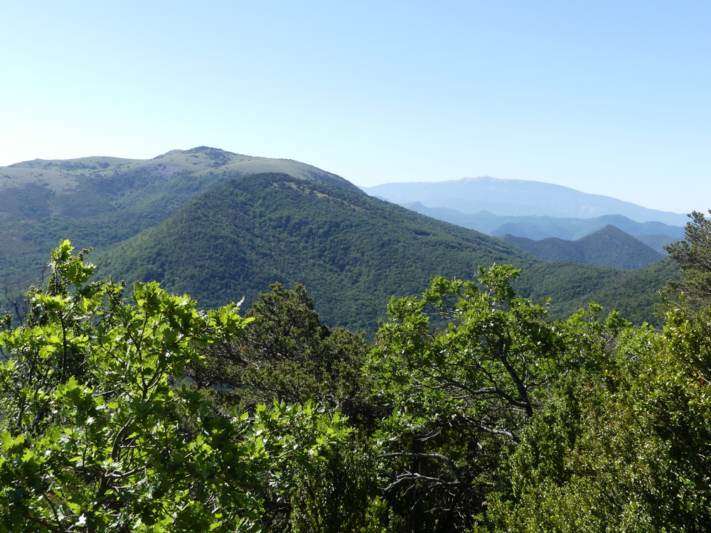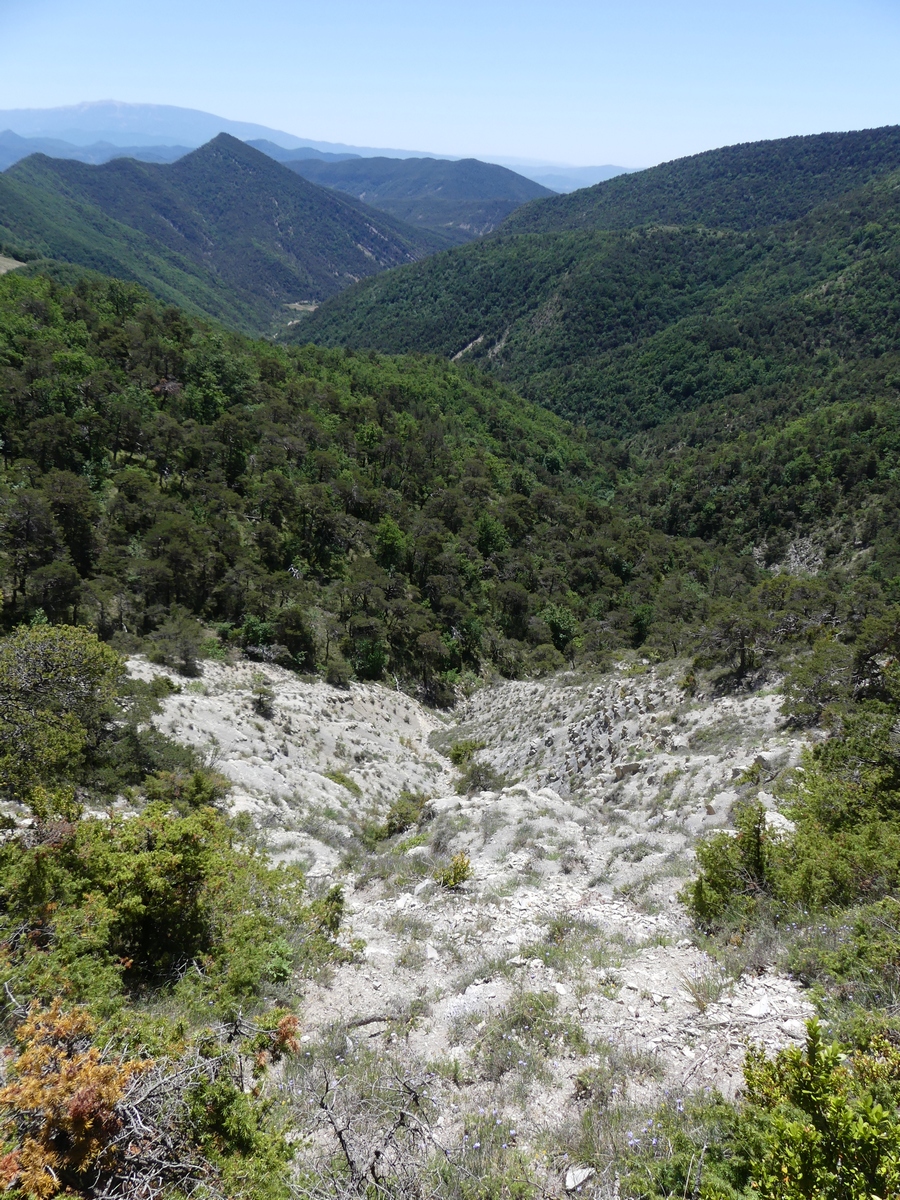 Nous débutons la marche par une piste qui longe lavandes et vignes et qui monte progressivement vers le col du Coucourdet. A droite le dôme boisé du Coucourdet et à gauche, face à nous, la crête rocheuse impressionnante de la Lance. On prend quelques forces avant de s’élancer sur un tout petit chemin sinueux et très pentu qui traverse une zone de magnifiques et gigantesques fayards qui ont pris racines en bas de la falaise. Nous nous arrêtons fréquemment pour contempler les sommets du Ventoux aux Trois Becs en passant par Cougoir, Angèle et Miélandre.