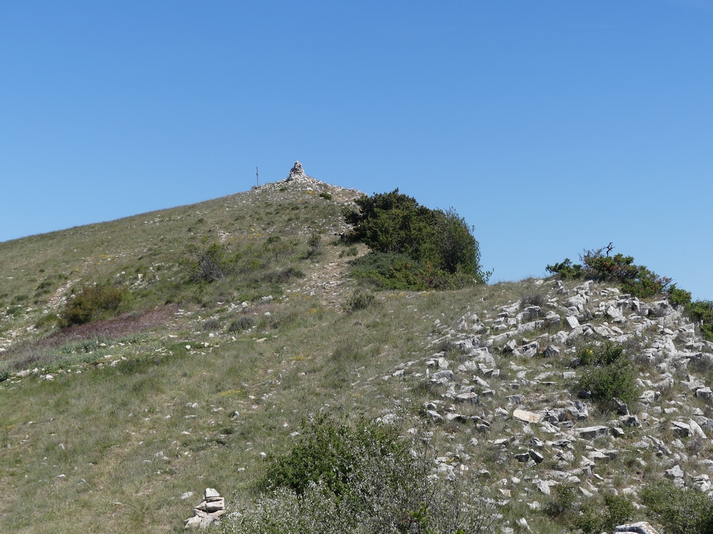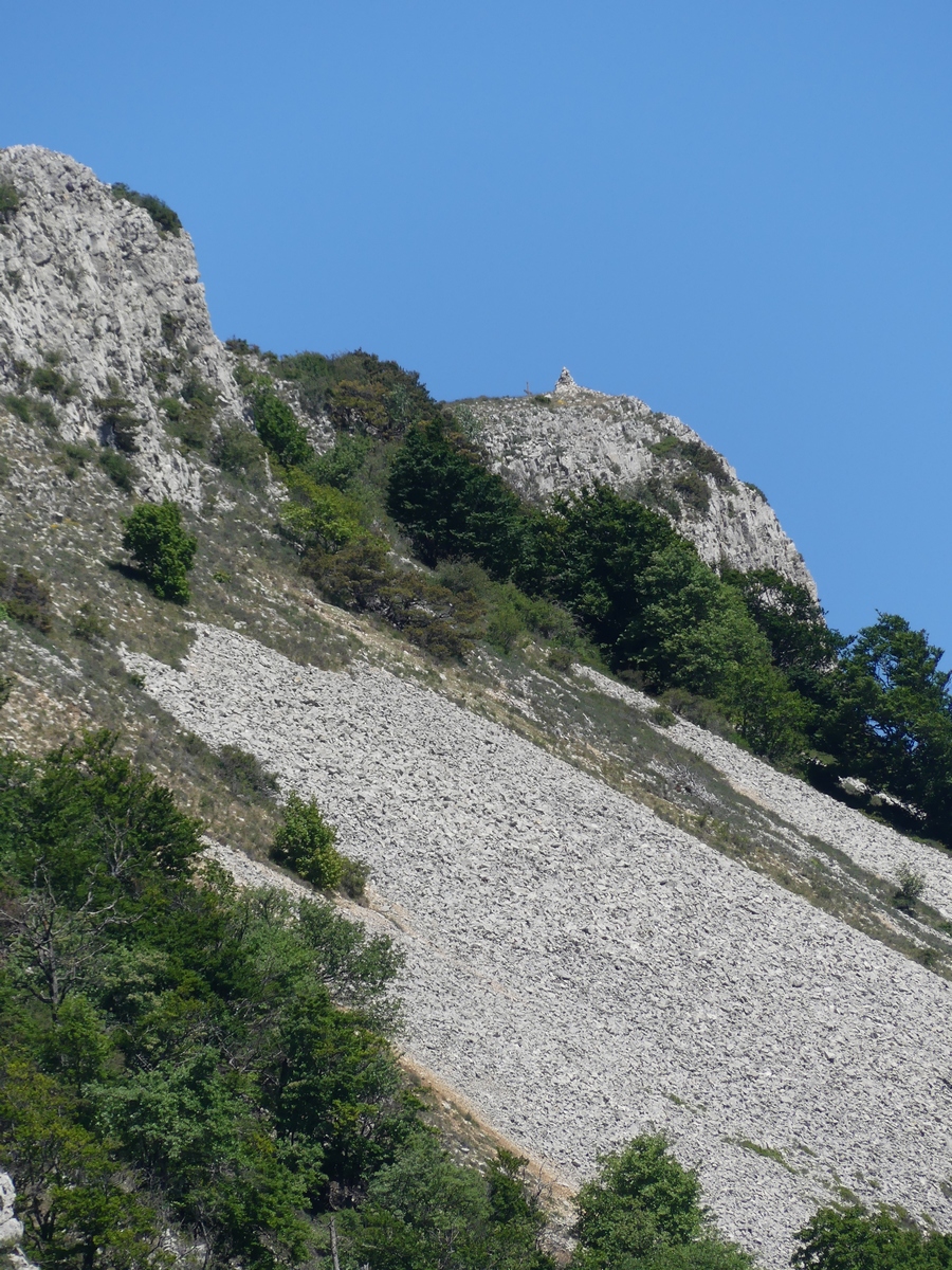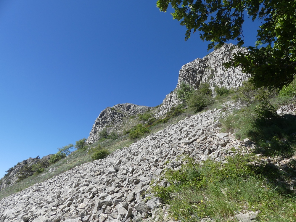 La végétation se fait plus rare et nous montons dans des pierriers avant d’atteindre la crête à une centaine de mètres de Rocher Garaux (1340m). Pendant toute la montée le mistral soufflait, atténuant les effets du soleil. En haut la petite laine est nécessaire et la vue incomparable.