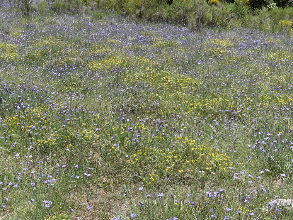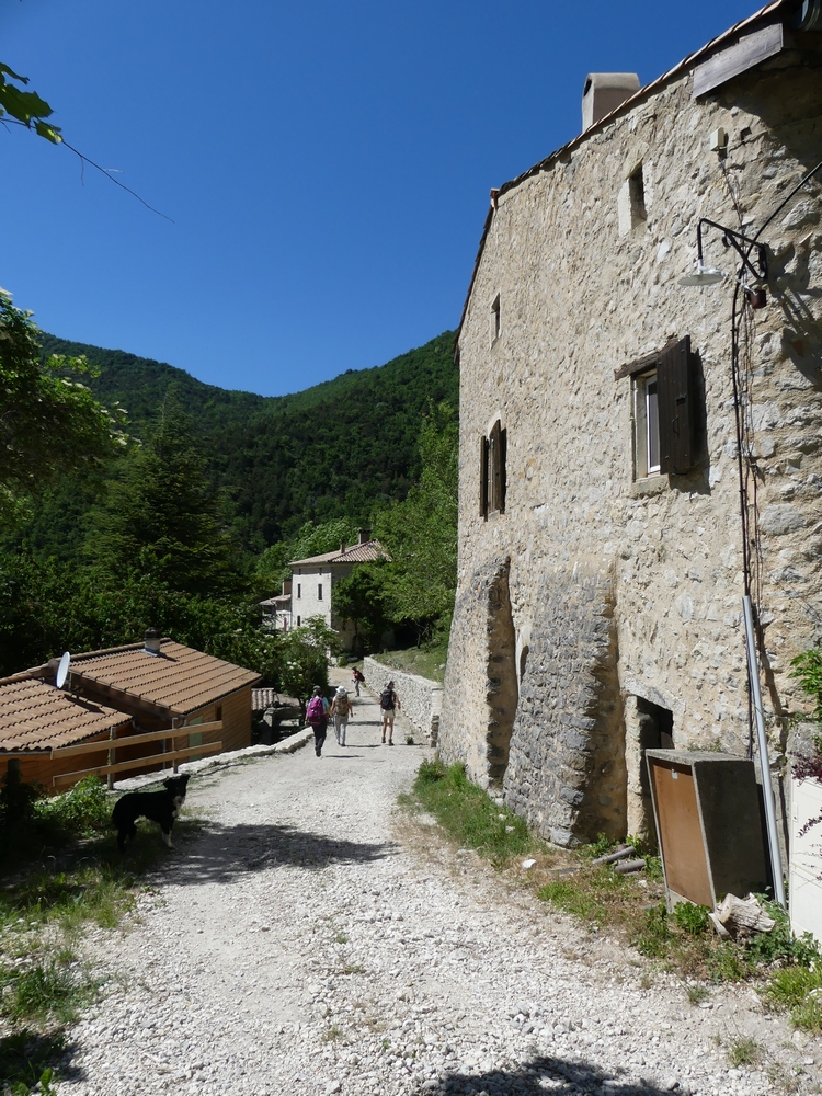 Nous redescendons par le GR9 jusqu’à la Grille où nous pique niquons à l’abri du vent. La descente vers le col de Lachaud est raide et surplombe la combe de Sauve ; des aphyllanthes de Montpellier et des fleurs de Lin tapissent le sol en arrivant au col. De là, nous continuerons d’emprunter la GR du tour du pays de Dieulefit jusqu’ à Teyssières. La piste remonte jusqu’au col la Pause en passant dans une zone de marnes blanches, puis suit l’adret de la Lionne. La vue sur la Lance nous montre la grande boucle que nous venons de faire. Nous traversons le vieux village avant de retrouver le parking.