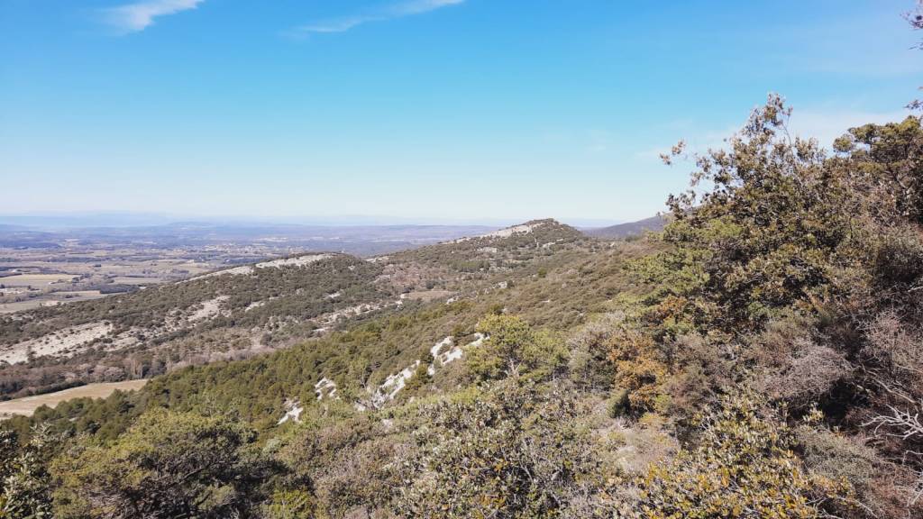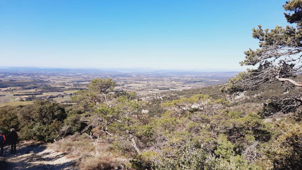 Le chemin étroit monte, monte et monte encore mais sans difficulté à travers une végétation dense, puis nous amorçons la descente qui nous laisse de beaux points de vue sur Grignan, Valréas et la vallée du Rhône d’un côté, Garde Grosse et le Ventoux de l’autre. Le retour sur le village du Pègue se fait par un chemin large et bien pentu, puis nous traversons Le Donjon pour revenir au parking. Nous sommes toujours 22, personne ne s’est perdu. Notre serre-fil, Gérard a assuré.