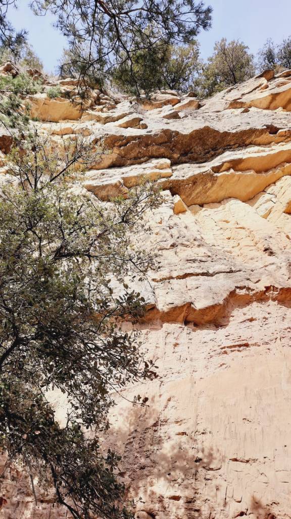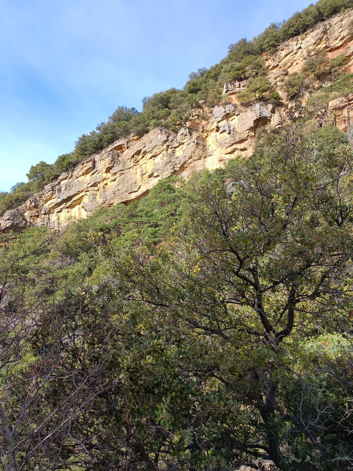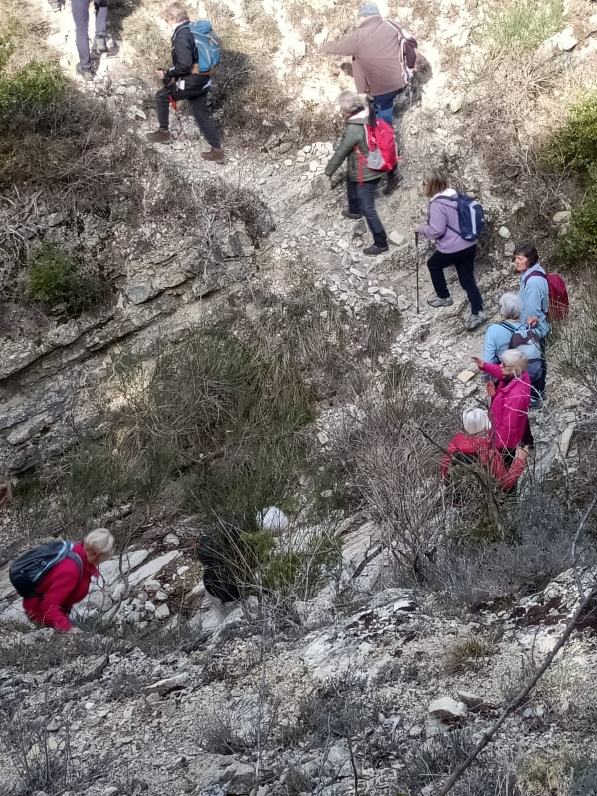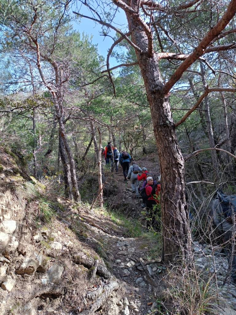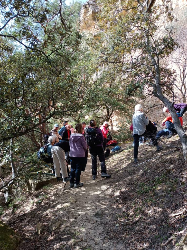 Par une large piste puis un chemin, nous nous dirigeons vers le ravin de Bruges et le ravin de Rocher Rouge. Nous remontons un cours d’eau sans une seule goutte apparente tantôt à gauche, tantôt à droite du lit asséché. En remontant le ravin, le paysage est tourmenté et magnifique au milieu des falaises feuilletées. Dans le sous-bois les premières primevères et leurs amies violettes nous accompagnent. Deux passages délicats sont franchis avec maestria par les 22 participants. Nous faisons une pause au pied de la falaise rouge et ocre aux reflets flamboyant dans le soleil du matin, pour admirer la vue sur ce ravin hors du temps où résonnent le chant de quelques oiseaux, un délice !