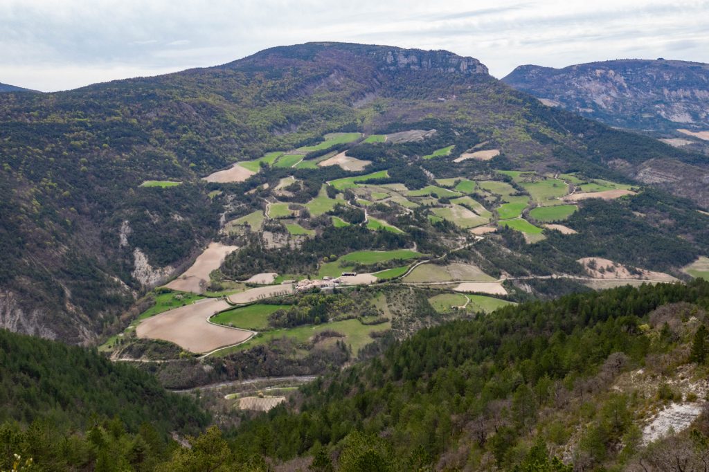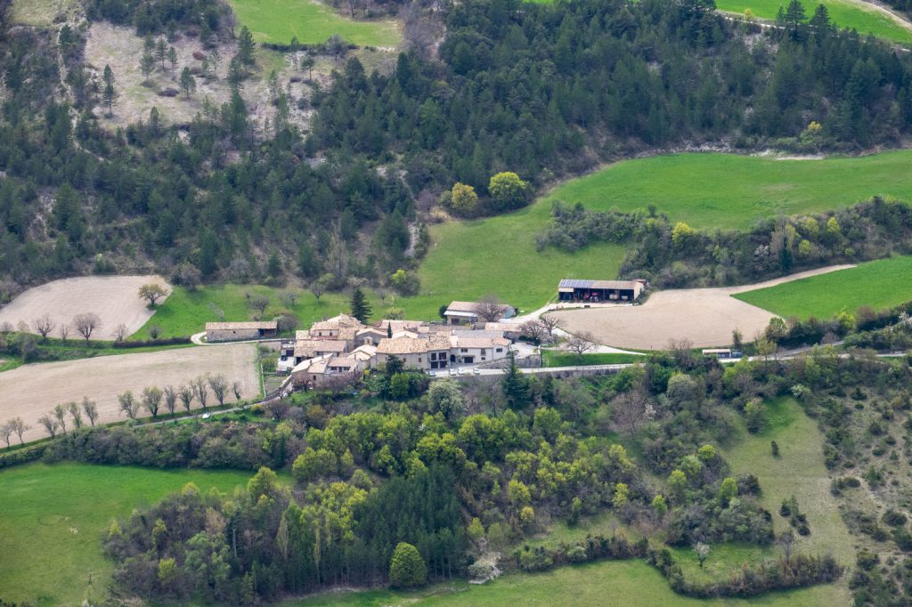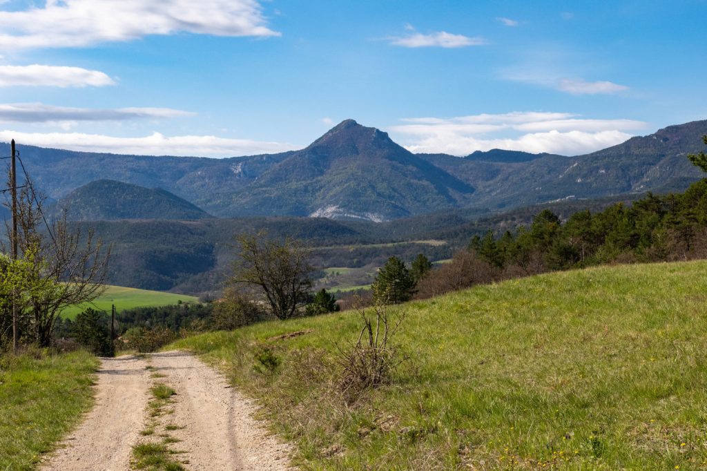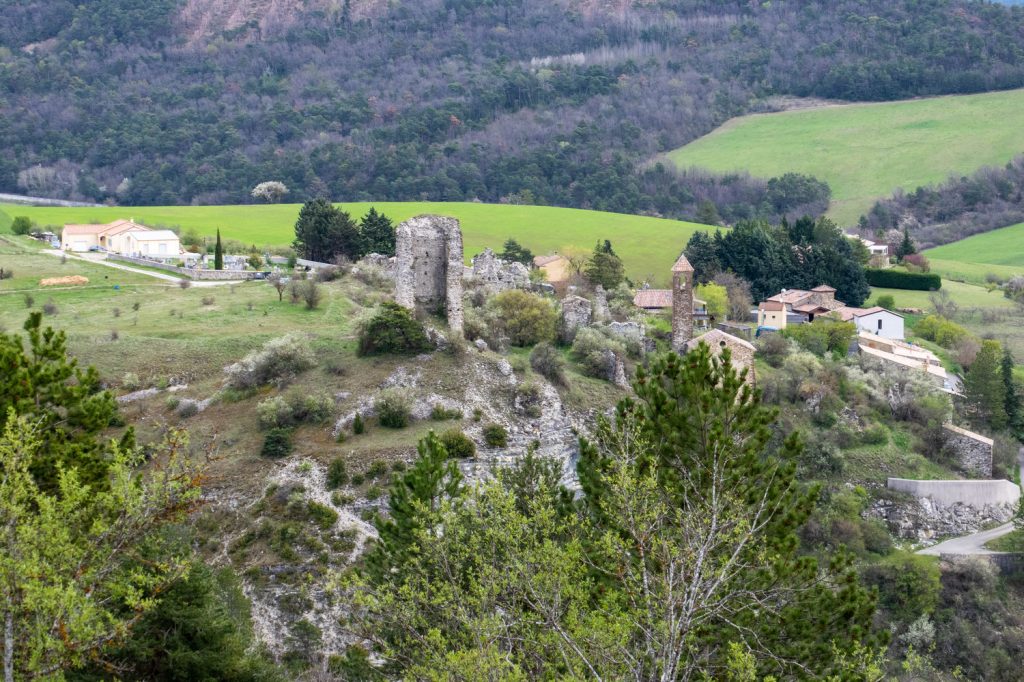 Une piste nous emmène jusqu’à une petite route goudronnée que nous suivons à gauche. Nous pouvons apercevoir le Fourchat qui surplombe Rosans.
