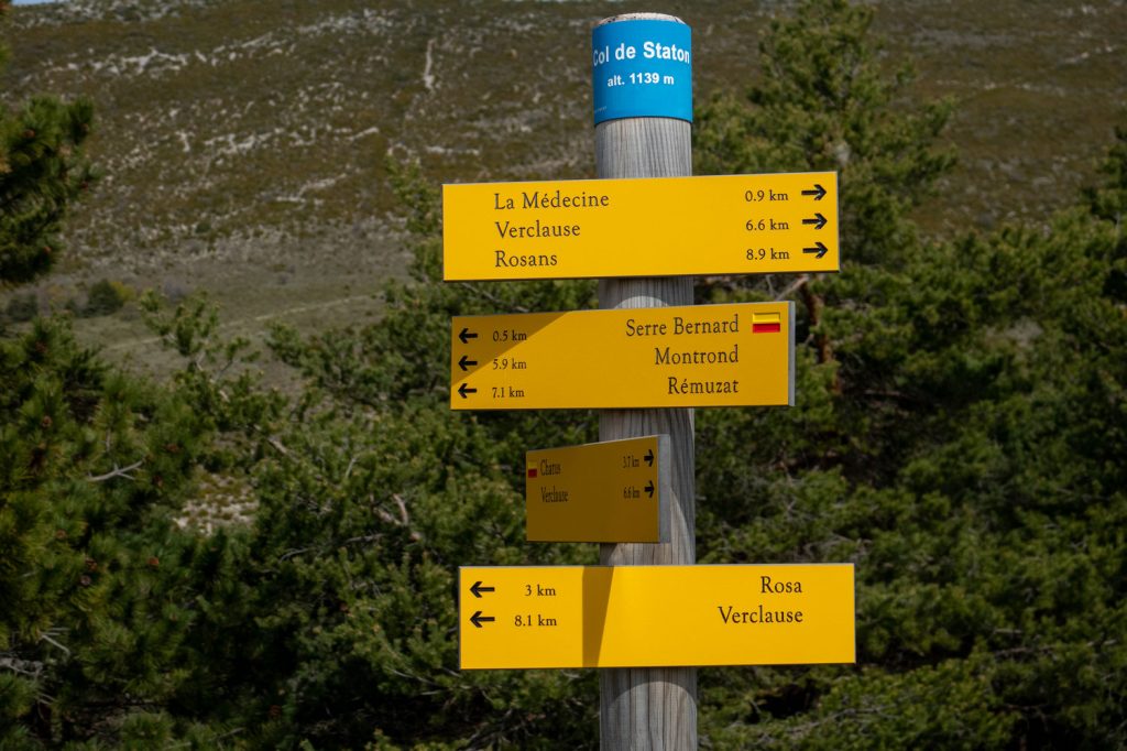 8 courageux randonneurs sont présents ce 23 avril pour monter au col de Staton. Nous démarrons du cimetière de Verclause sur le site de l’ancien village médiéval perché sur un promontoire, dont il ne reste qu’une tour en ruine, et descendons une piste pour franchir le gué, à sec en ce printemps si peu pluvieux. Puis nous prenons la route goudronnée en direction de Chatusse, avant la ferme, nous prenons la piste qui nous emmènera au nord vers le col : 4,5 km d’ascension assez raide dans les bois.