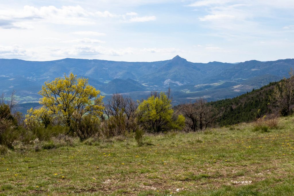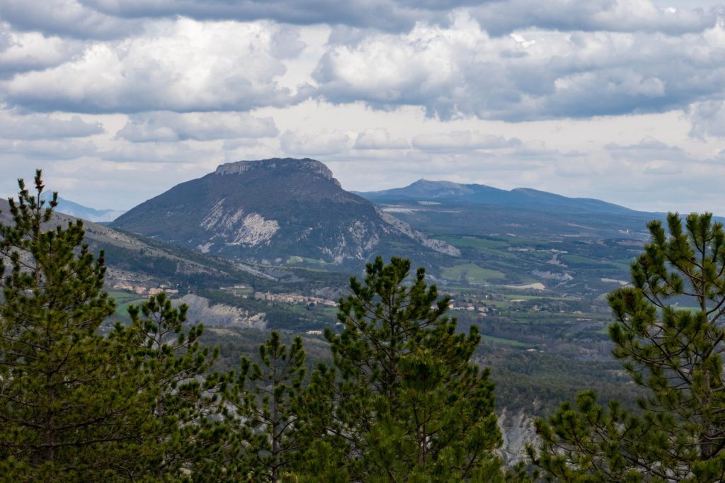 Poursuivant notre sentier, nous franchissons la falaise, et plus loin au débouché d’un virage, arrivons dans un espace dégagé : vue sur la Vanige et les Baronnies au sud, la haute vallée de l’Eygues vers l’est, avec le Risou en premier plan. A nos pieds, le village de Pelonne.