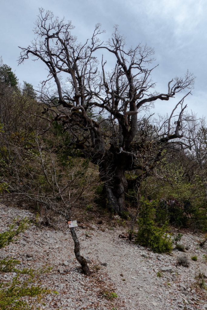 Nous plongeons dans le vallon, direction Rémuzat : dans l’échancrure, face à nous, la Montagne du Poët coiffée de son antenne et le col d’Ambonne. Nous nous arrêtons au col Lemart dans une clairière ensoleillée et à l’abri du vent pour la pause déjeuner. Puis reprenant nos sacs, nous descendons toujours sur une piste caillouteuse qui nous conduit à la Cabane de Clermont, jolie petite cabane forestière, à proximité d’un ruisseau que nous franchissons pour remonter à La Poirière. Là, nous partons plein est, dans une plantation de pin, sur une piste qui se transforme bientôt en agréable sentier en balcon, tantôt montant, tantôt descendant, franchissant plusieurs ravines à sec. Au croisement « La Rosa », nous continuons toujours vers l’est pour arriver aux ruines d’une ancienne ferme. Nous nous arrêtons brièvement pour admirer les belles pierres de taille qui encadrent encore les portes et deux beaux chênes devant la ferme et repartons pour découvrir bientôt un troisième chêne, extraordinaire. Il a au moins 300 ans et a été façonné par l’homme qui coupait ses rameaux pour nourrir le bétail, et par les bêtes elles-mêmes qui rongeaient son écorce, ce qui l’a conduit, pour se protéger, à former des bourrelets.