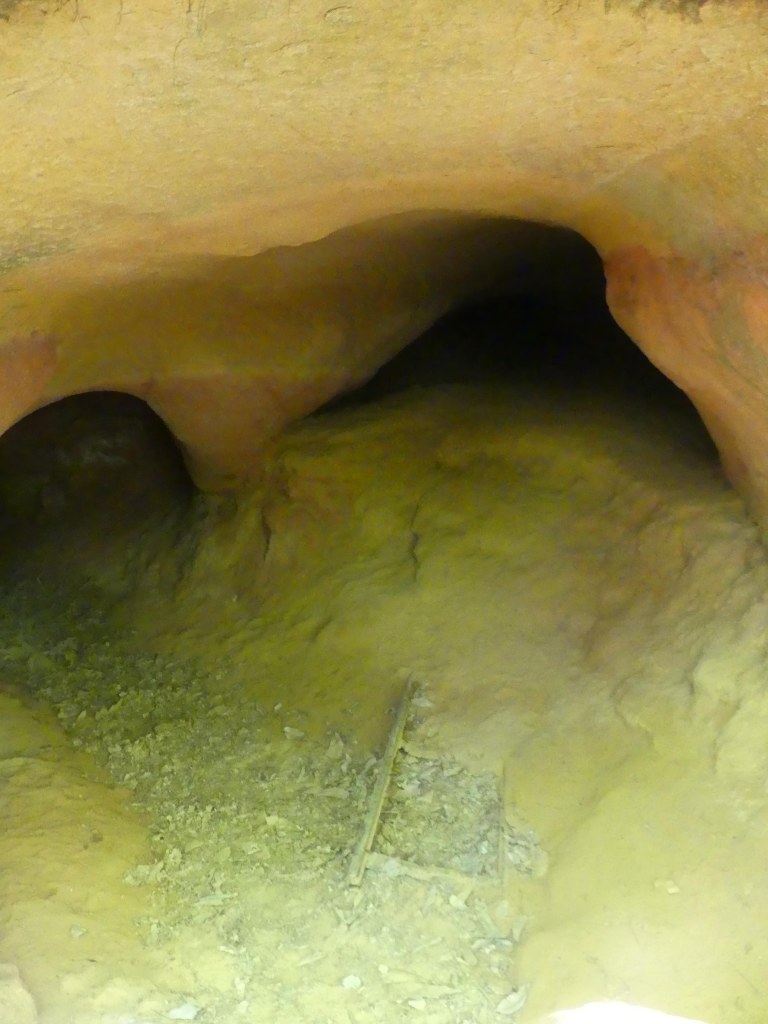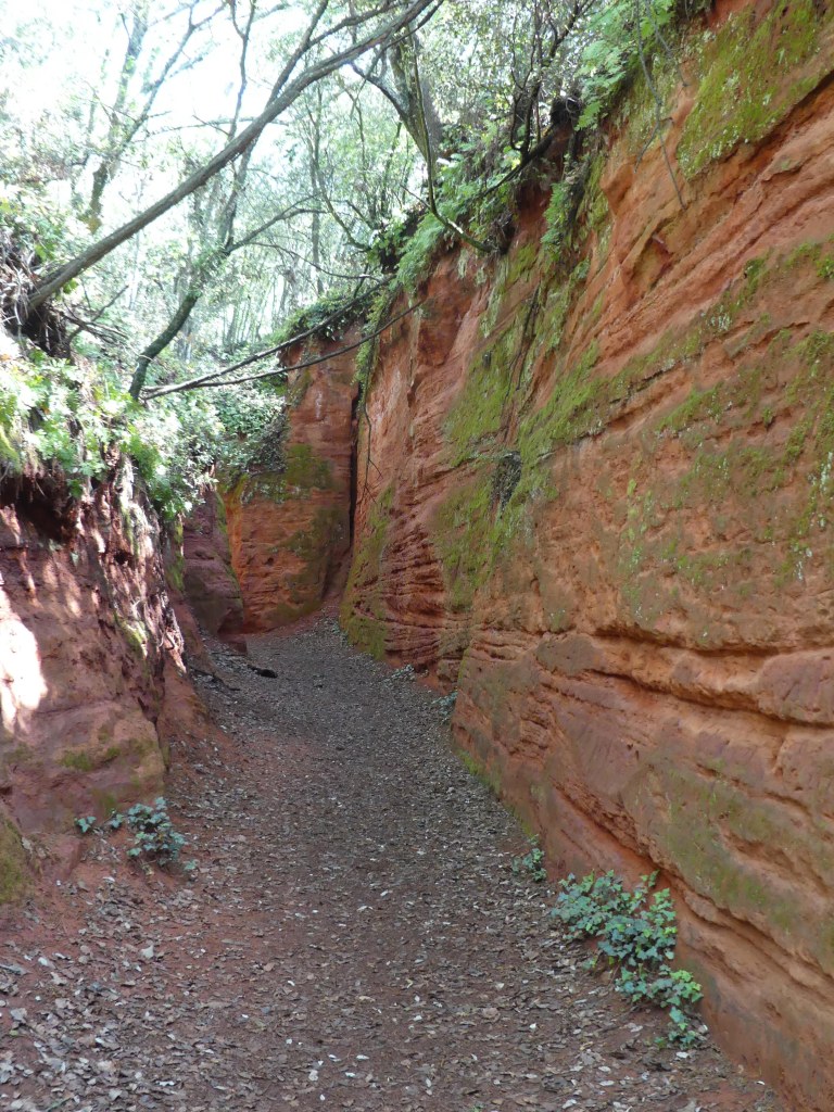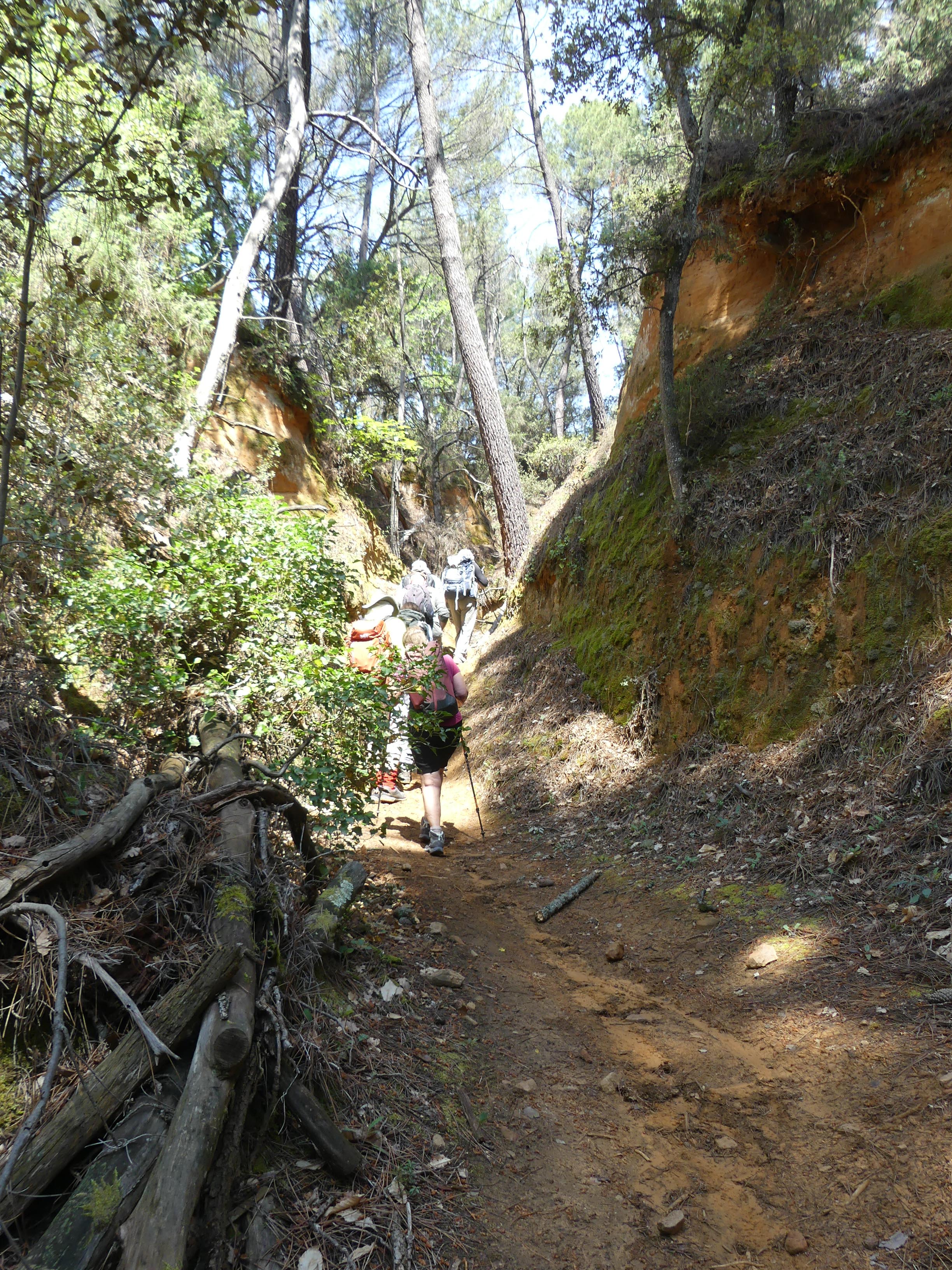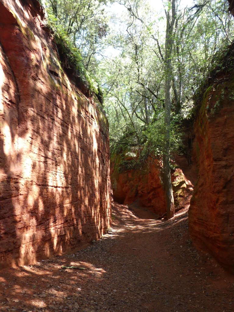 Nous nous enfonçons à nouveau dans la forêt et trouvons un canyon aux falaises ocres. Le soleil qui darde à travers la végétation nous offre de beaux reflets de couleurs. Un peu plus loin, très bien cachées au fond des bois, nous découvrons les entrées des galeries souvenirs des carrières d’ocre exploitées jusqu’en 1967 par la société des Ocres Françaises. La taille se faisait à ciel ouvert, d’où le canyon, ou dans des galeries creusées dans le massif. Les briques d’ocres étaient ensuite broyées et tamisées avant d’être expédiées sur Apt pour être mélangées et cuites afin d’obtenir les couleurs désirées.