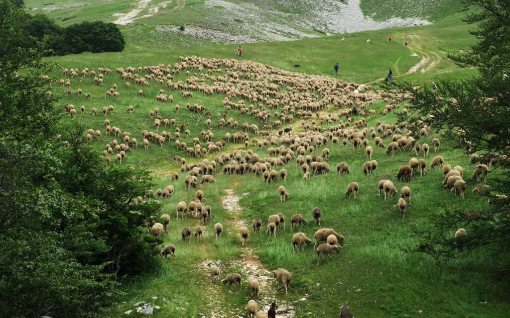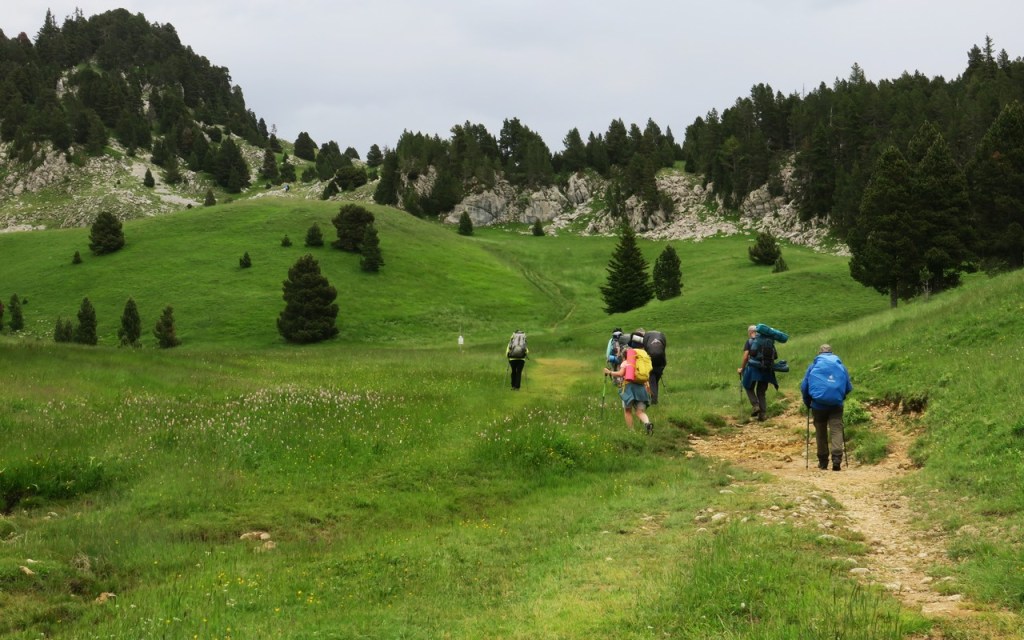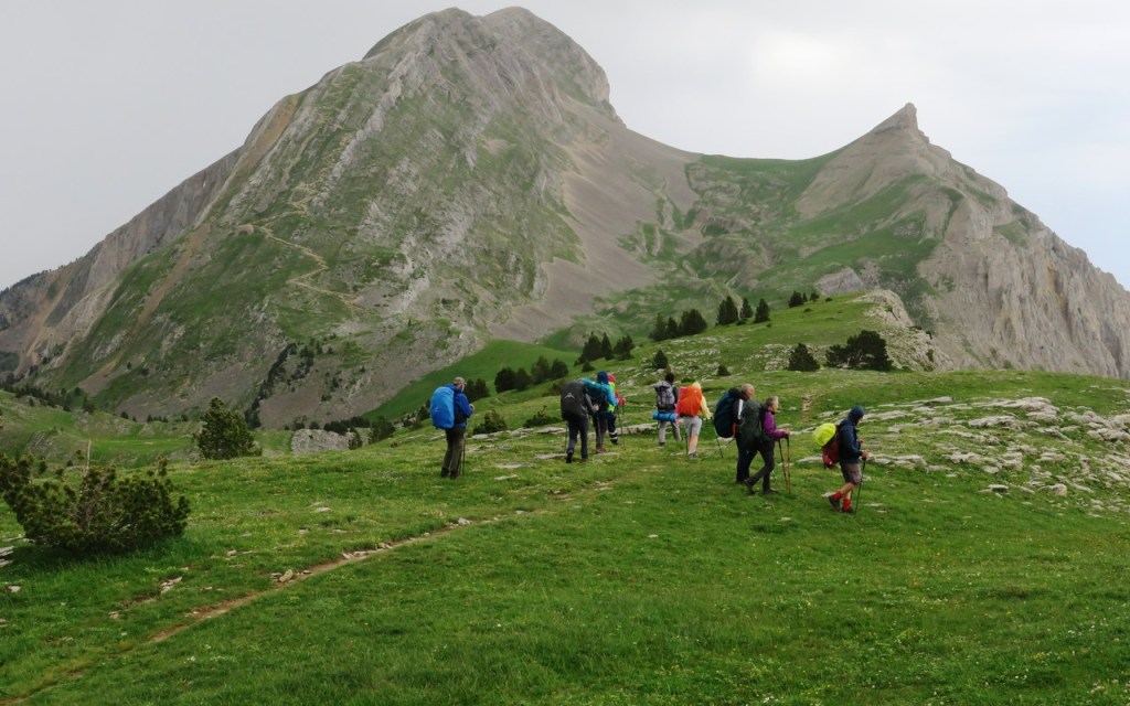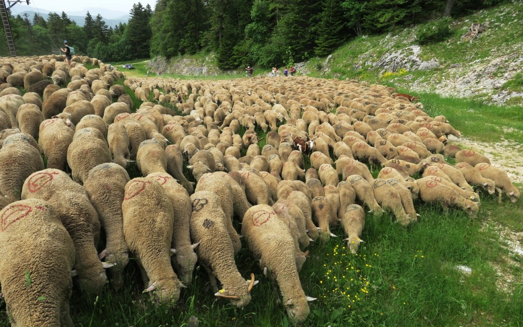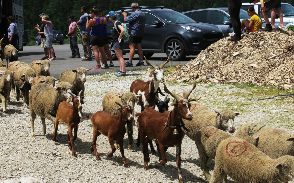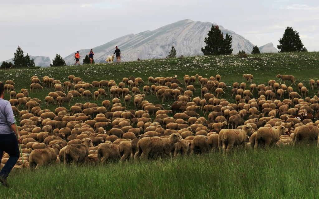 C’est vers 16h15 que s’effectue le départ ; nous nous chargeons de nos gros sacs contenant le matériel nécessaire pour durer jusqu’au lendemain après-midi. Que nous soyons devant, derrière ou de temps en temps sur le côté, nous allons suivre le rythme des brebis, agneaux, béliers, chèvres et boucs tout au long du parcours de 7km. Un Border Collie, des Patous, des Bergers de Crau, et des Bergers d’Anatolie surveillent la progression du troupeau. Le rythme est lent et nous adaptons notre pas à celui des bêtes à travers les pâturages, les pistes et la nature sauvage. Nous goûtons la beauté des paysages et des fleurs qui parsèment notre itinérance (trolles, lis de St Bruno, gentianes,…) Après avoir franchi le Belvédère (1639m), nous descendons au Pas des Econdus et entrons dans la zone naturelle des Hauts Plateaux du Vercors.