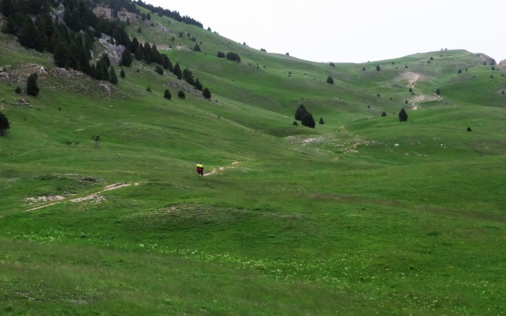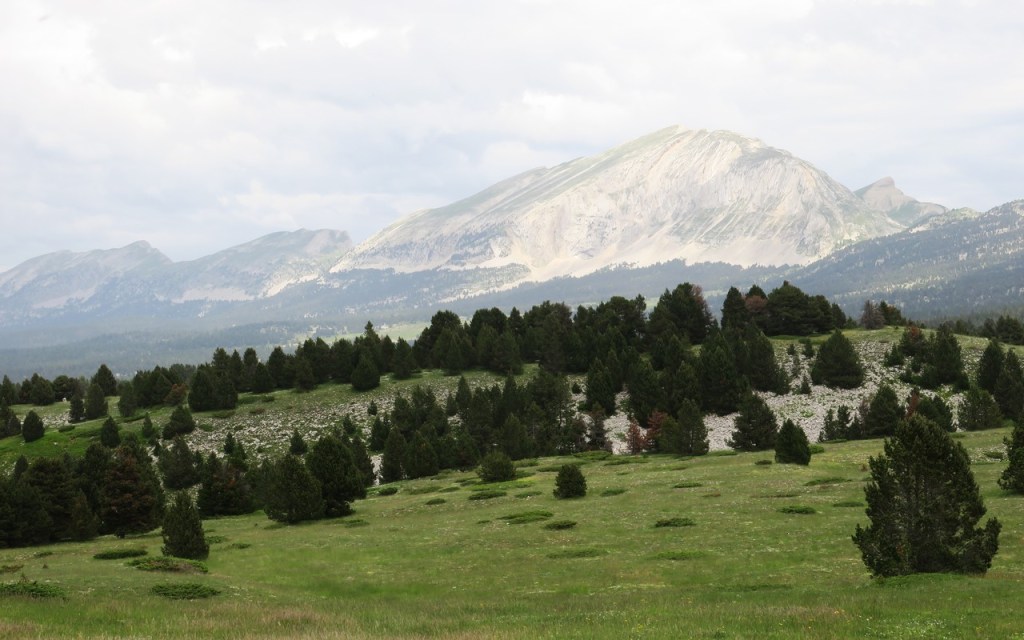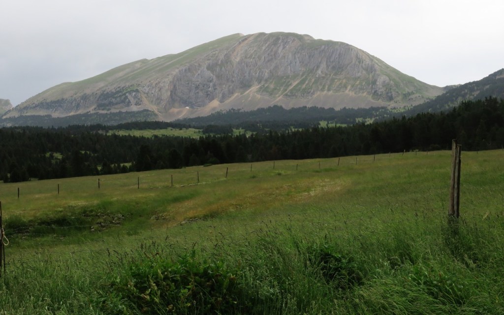 Un petit détour par le Pas de Chabrinel où nous avons une vue magnifique sur le Rocher de Plautret avec, au loin dans la brume, les Trois Becs. Voie de passage depuis l’époque romaine, elle a été empruntée par Aline et son troupeau montant vers les hauts plateaux au milieu des années 1980.
