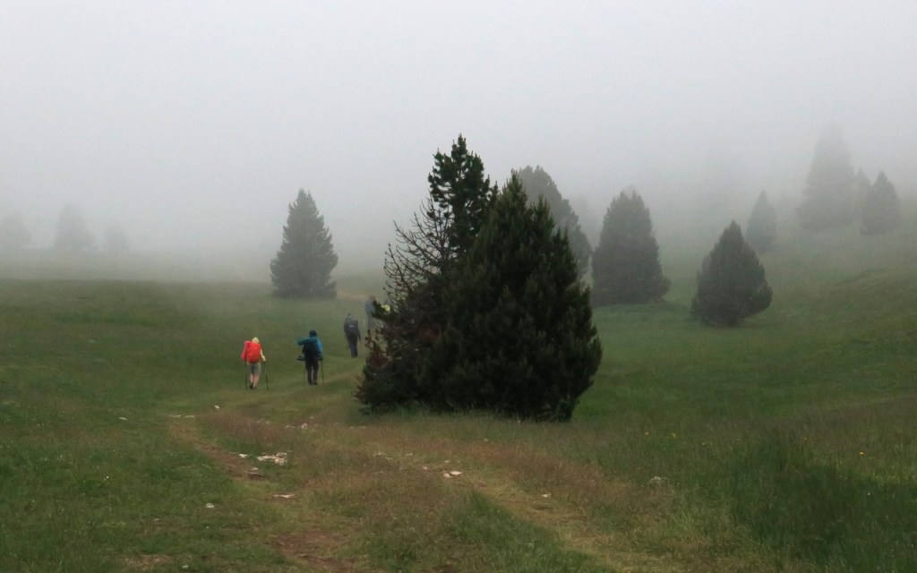 Les gros nuages noirs en face de nous annoncent l’orage et Aline décide d’abandonner les crêtes pour revenir directement au parking. Nous sommes effectivement pris par de très violents coups de vent et un vrai déluge ; en moins d’une minute nous sommes trempés et les chemins se transforment en cours d’eau. Au plus fort de l’orage on se protège du vent près d’un bouquet de sapins. On reprend notre chemin et il nous faudra 1h30 pour regagner le parking sous l’orage. Comme des automates nous avançons avec précaution sur ces pistes. Une nouvelle expérience qu’aucun des 10 participants n’avait encore vécue avec cette intensité.