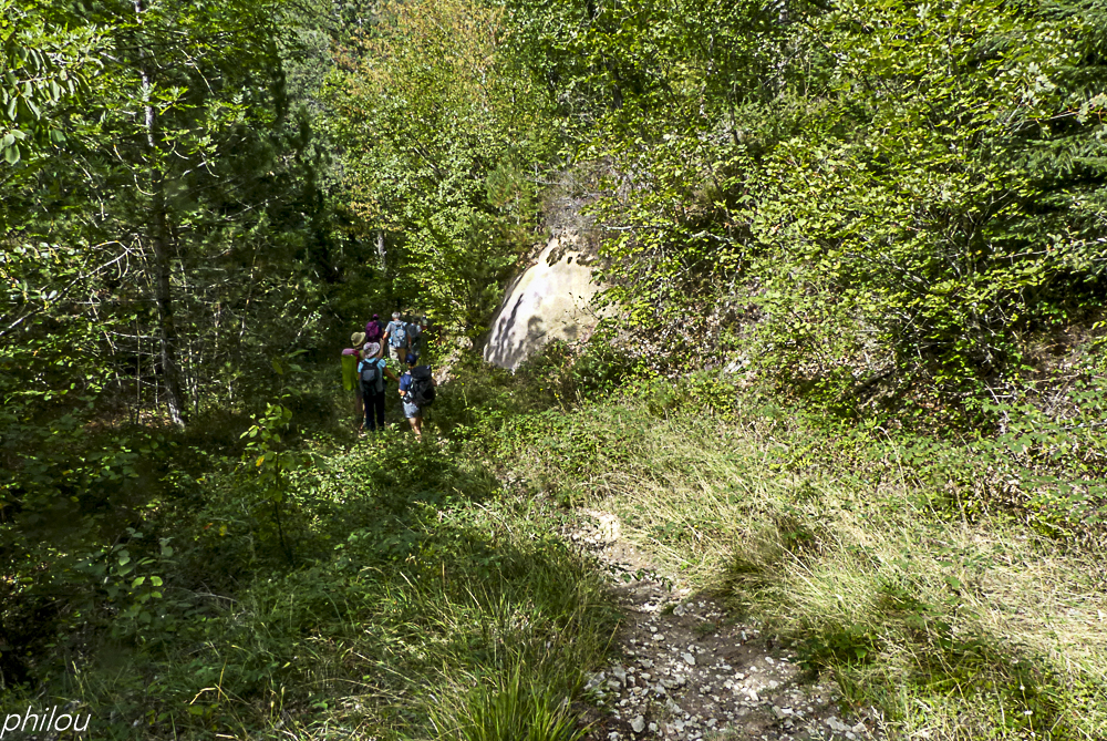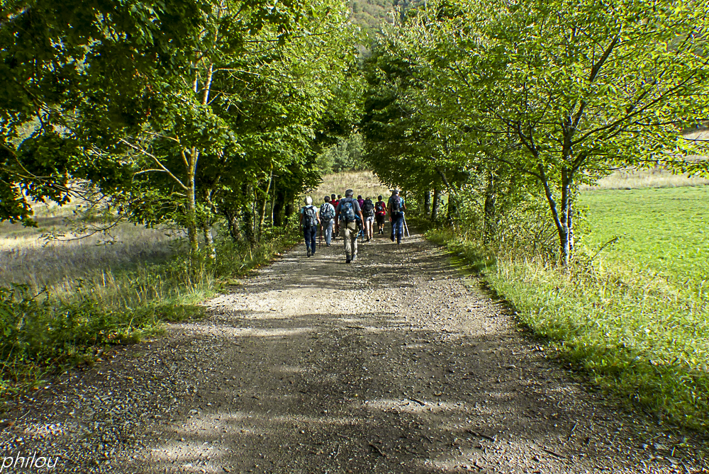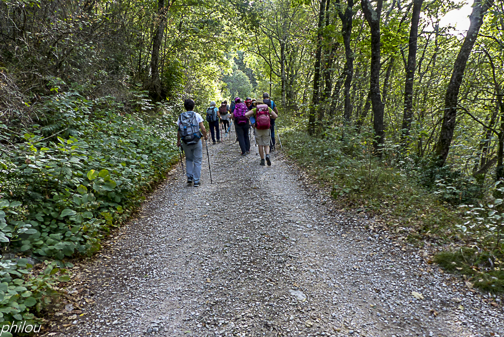 On descend vers les ruines d’un monastère construit au 12ème. Habité par des chanoines de Saint Augustin, puis utilisé par les Antonins comme hôpital pour les lépreux il fut consolidé par un chantier de jeunes internationaux entre 1988 et 1995. On peut voir les restes de l’abside, de quelques murs et voûtes. Descente tranquille par une belle piste sous les arbres. Au carrefour de la Selle, forte montée jusqu’au Pas Court où nous prenons un pique-nique bien mérité. Le groupe de douze avec trois nouveaux randonneurs profite de ce temps de convivialité.