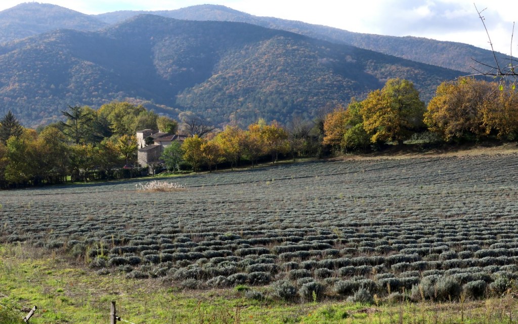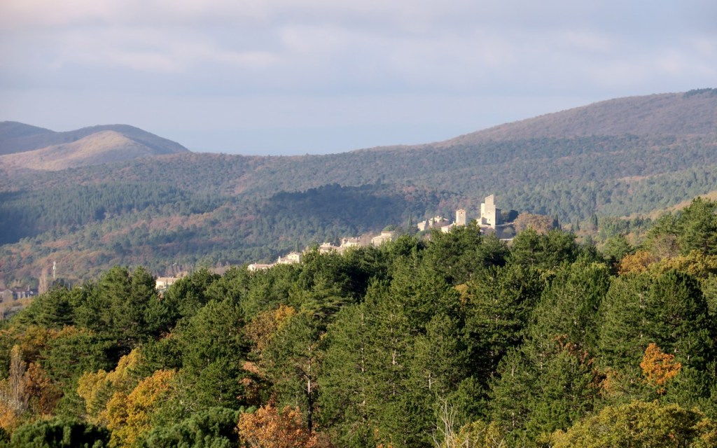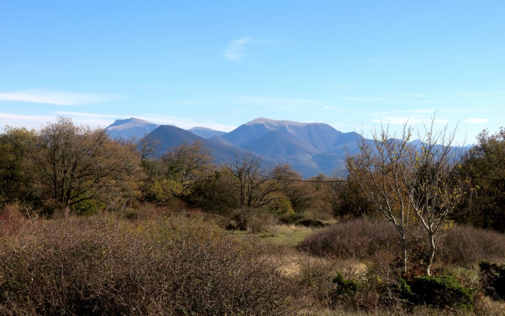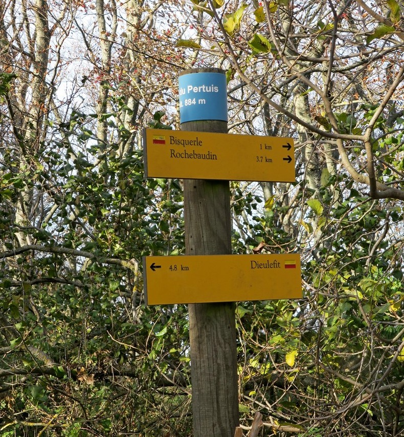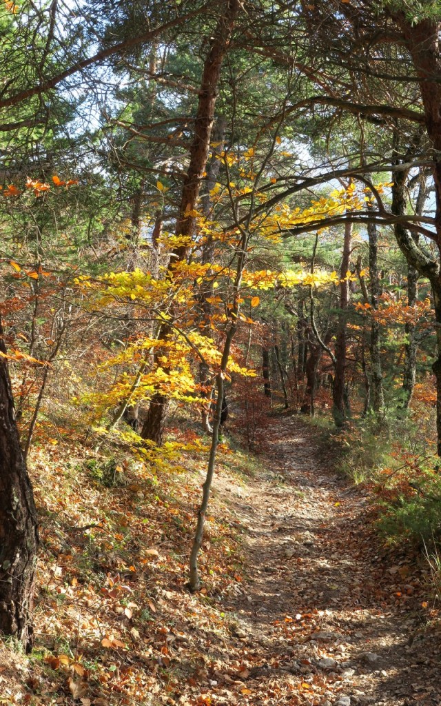 Nous suivons le bord de falaise jusqu’au Col de Pertuis et basculons vers le sud, d’abord dans une belle forêt de hêtres dont les feuilles mortes tapissent le sol, puis le sentier caillouteux nous ramène à Dieulefit par une longue descente.