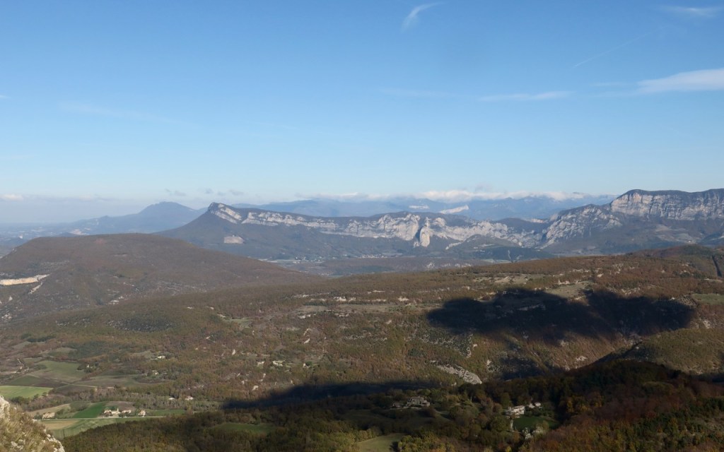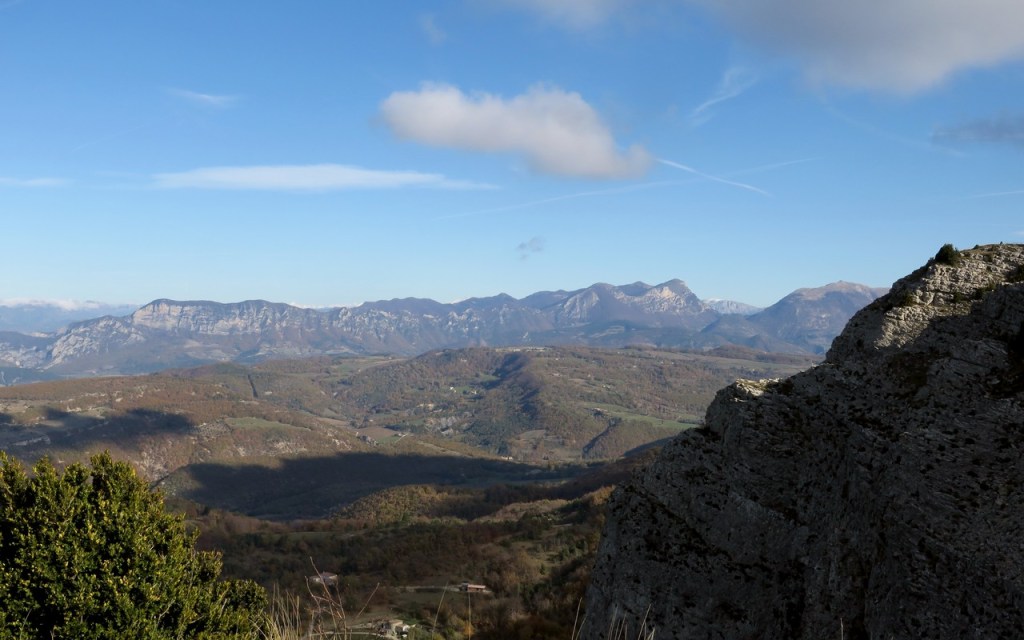 Après le repas, nous nous approchons de la falaise. A nos pieds les villages d’Eyzahut et Pont de Barret. A l’ouest s’étant la plaine du Roubion. Au nord et à l’est la forêt de Saou et Couspeau. Et tout au fond derrière la forêt de Saou, les sommets enneigés du Vercors.
