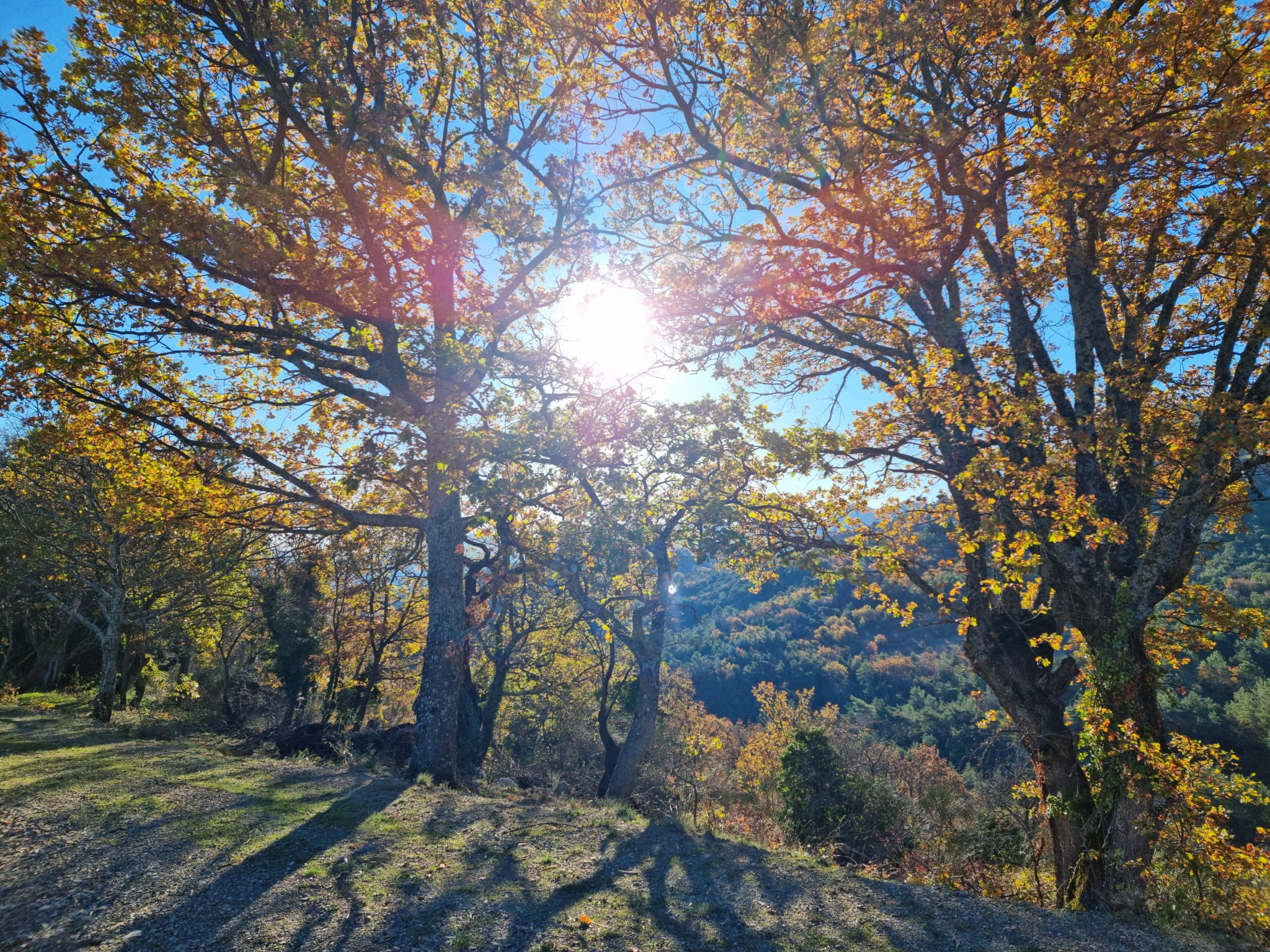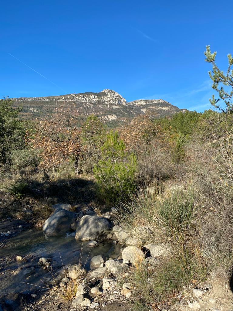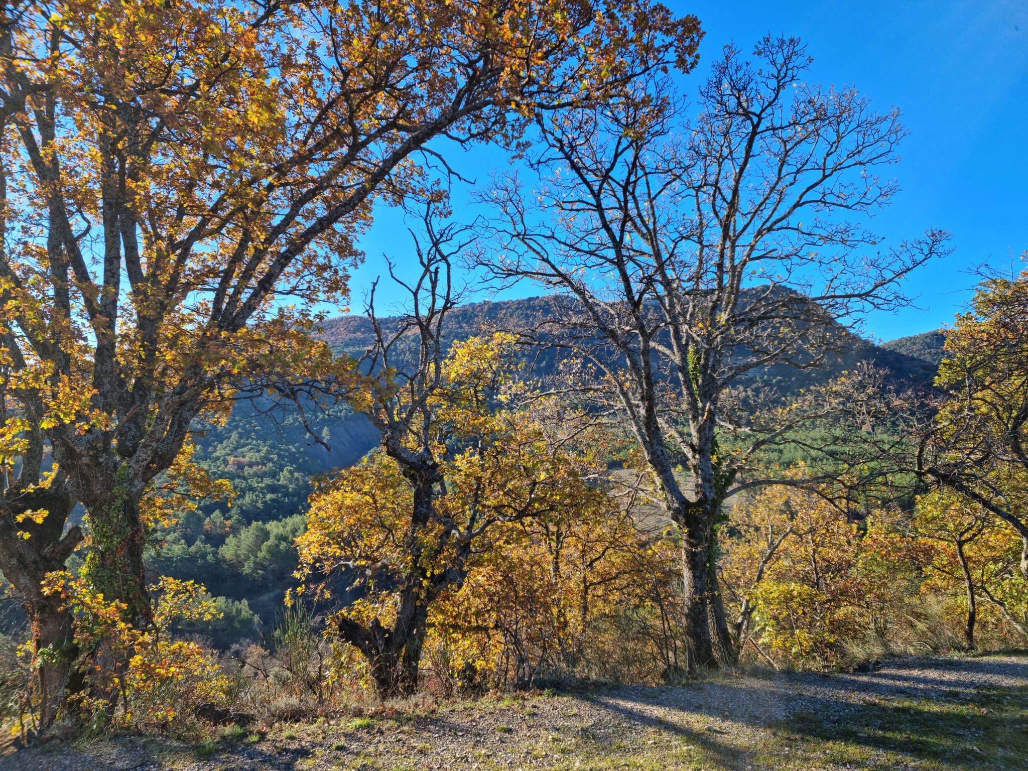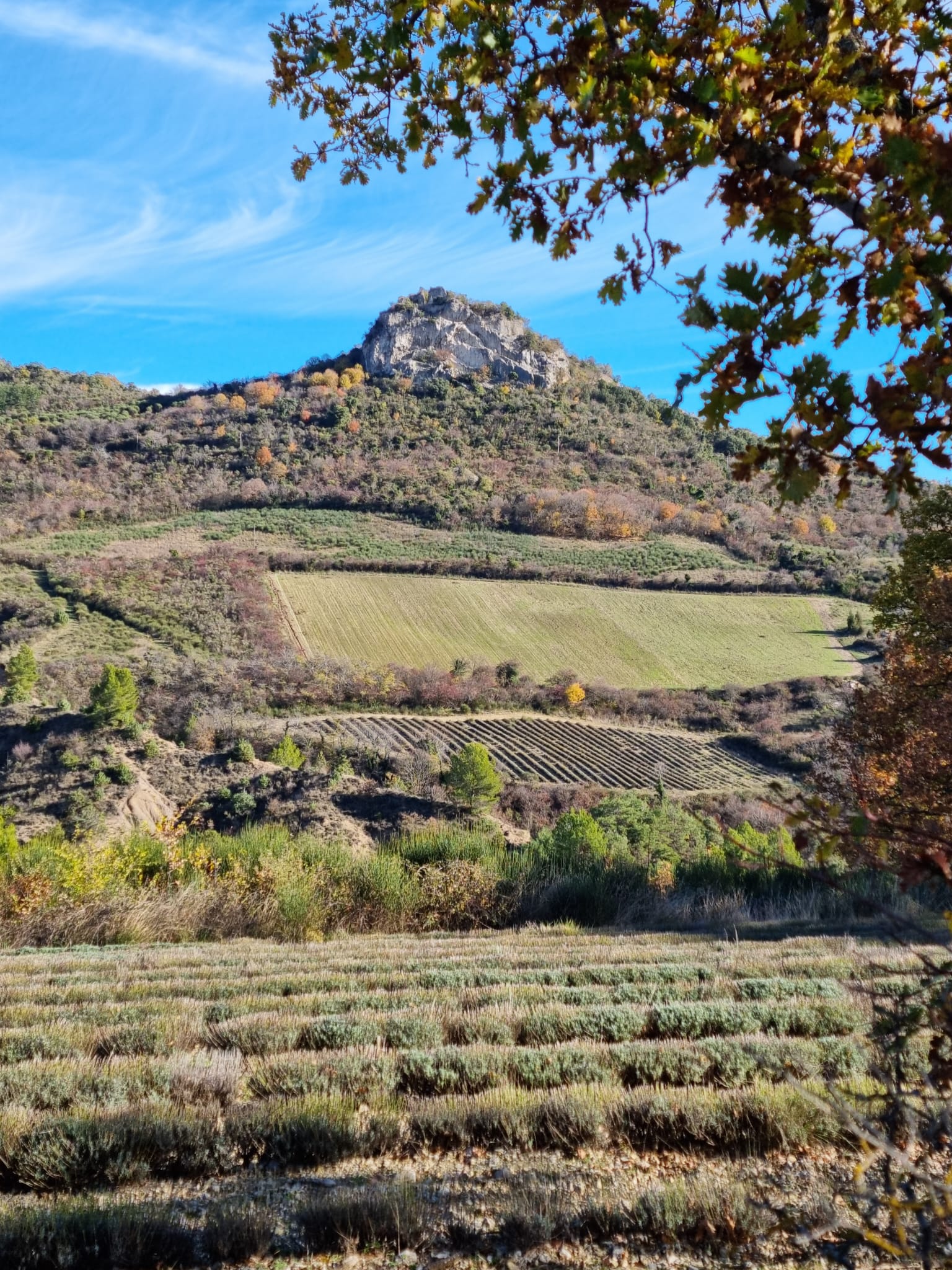 Les couleurs d’automne sur les vignes et les arbres sont magnifiques. La vue sur Angèle avec son sommet enneigé ainsi que le Cougoir face à nous suscitent notre admiration et invitent à une petite pose contemplative.