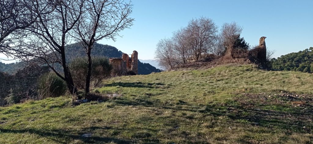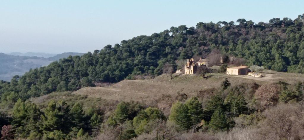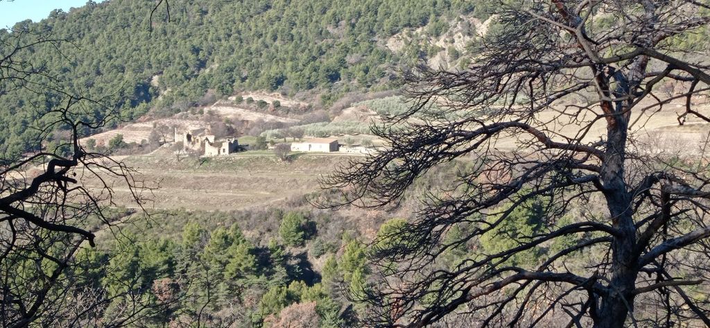 Après avoir longé plusieurs vignobles, nous atteignons une forêt de pins. Très belles vues à droite sur le Ventoux , à gauche sur Piégon et au loin la vallée du Rhône. Après 220m de dénivelé, nous laissons à droite la piste vers Maneyrole pour descendre vers le hameau en ruines des Géants.