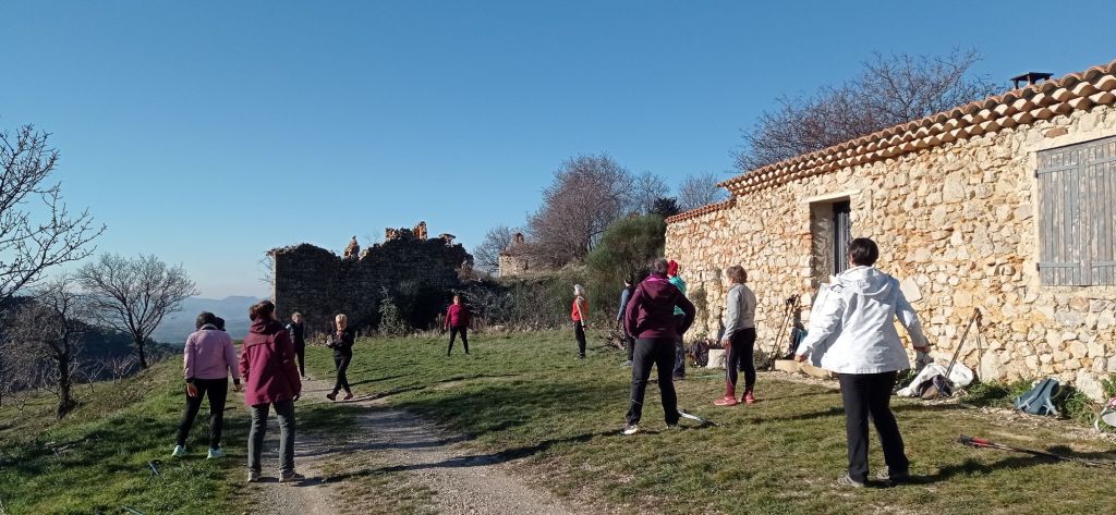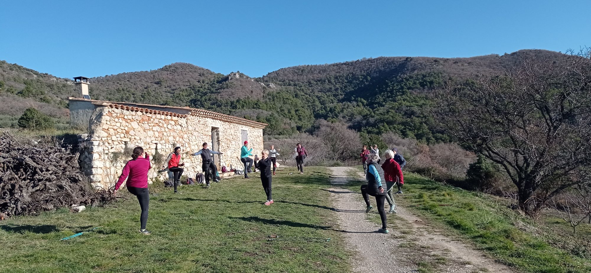 Retour par le même chemin en ayant des vues différentes mais aussi jolies. Le soleil éclaire ces vallons entre Piégon et Puyméras. Des étirements clôturent la séance avant le partage d’une galette.