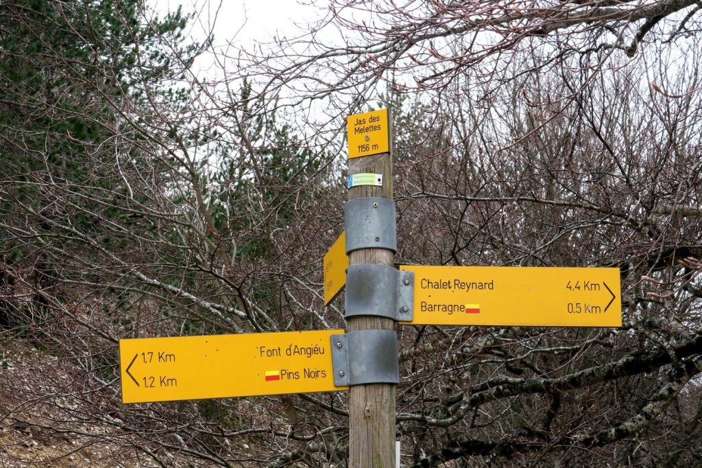 Nous reprenons le chemin du retour en passant par le Petit Moutet et le carrefour des 4 chemins de Perrache et, peu après se découvre devant nous le mont Ventoux juste avant de rejoindre nos voitures.