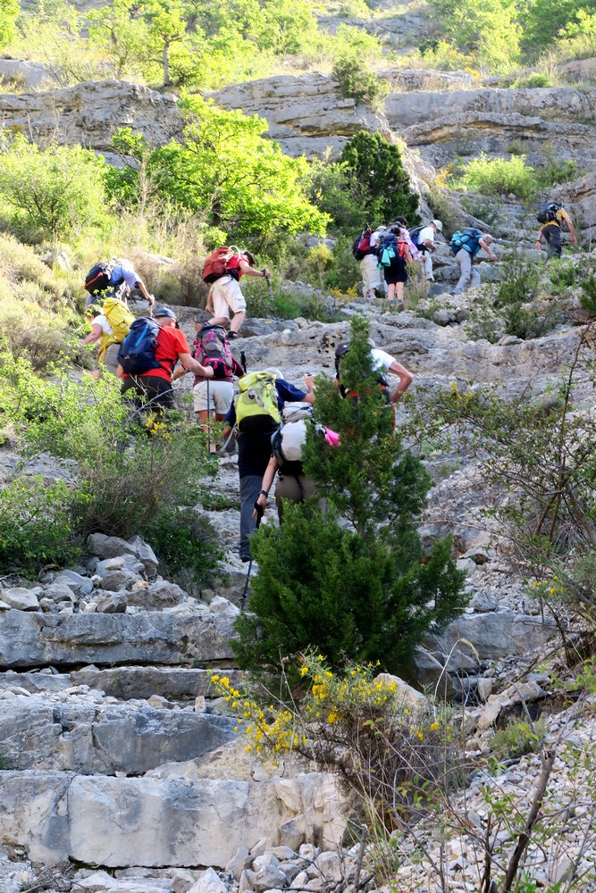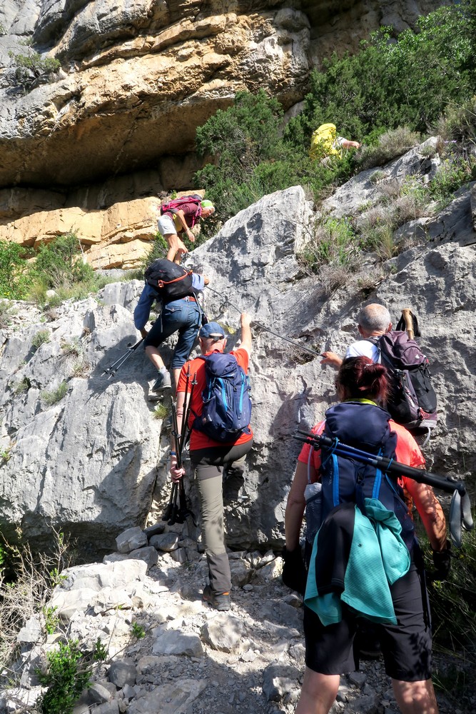 L’aménagement du sentier avec une grande échelle, des mains courantes et de petites marches en fer permet une progression sans grosses difficultés. La vue sur l’Eygues devient impressionnante.