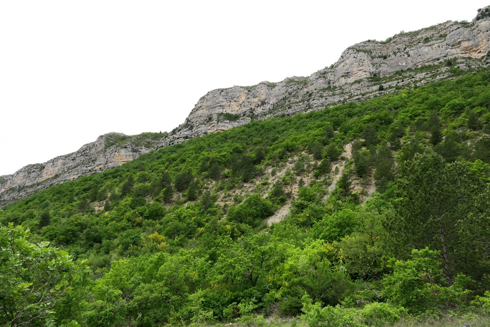 La piste ombragée longe l’Oule puis se transforme en chemin empierré au bord de l’Eygues. L’eau claire qui s’écoule en chantonnant invite plus au repos qu’à l’effort physique. Bientôt une belle échancrure dans la falaise s’offre à nous. Le chemin qui est devenu très pentu nous amène au pied de la falaise.