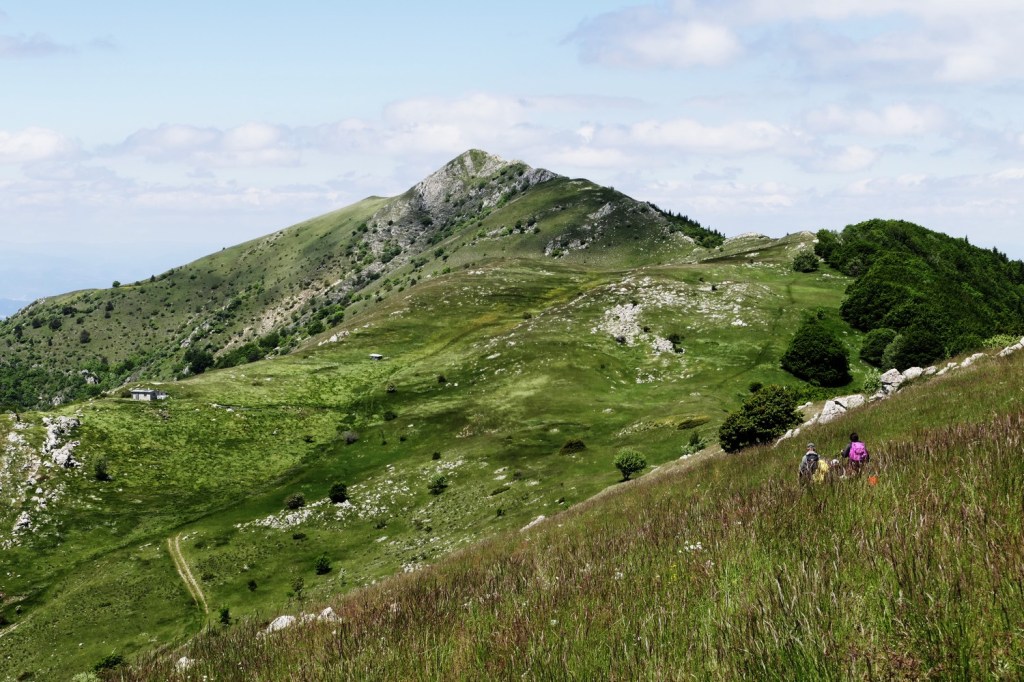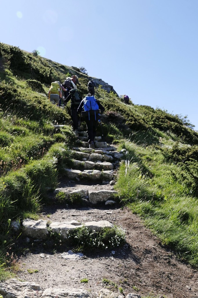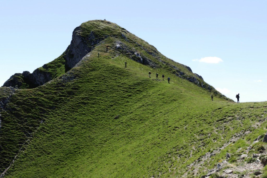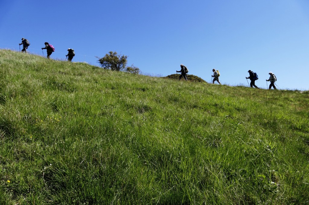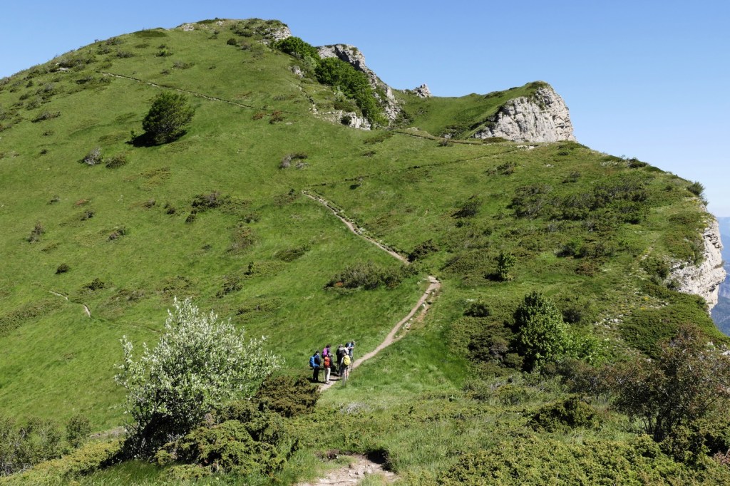 Le chemin qui monte au Grand Delmas est très raide par endroits. Nous franchirons les premiers 400m de dénivelé en une heure, avec de très beaux passages dans un bois de hêtres, avant d’atteindre la crête de la Grazonnière. Le vent frais qui souffle en rafales nous contraint à mettre une polaire. Nous repartons en direction du sommet à travers une prairie pentue balayée par le vent. Nous prenons le temps de contempler la vue à 360° qui s’offre à nous : les falaises verticales des Trois Becs, le plateau du Vercors et vers le sud nos chers sommets des Baronnies (La Lance, Angèle, Miélandre et Cougoir) qui précèdent le Mont Ventoux.