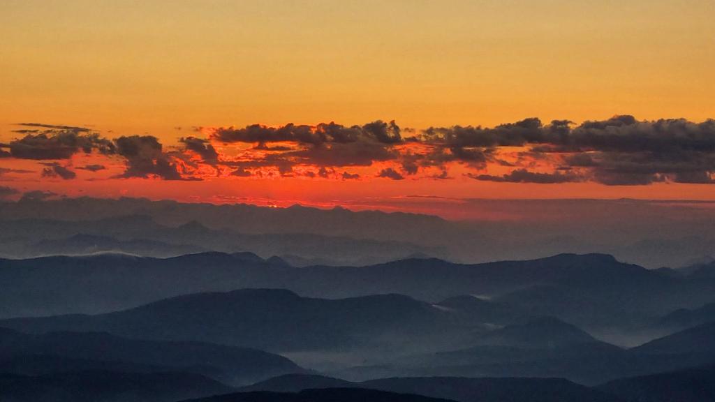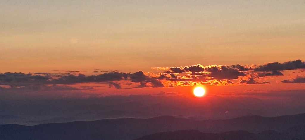 A 5h30, l’aube rosit le trait d’horizon et on éteint nos lampes. Au sortir de la forêt, il faut se couvrir. Le vent est froid et nous glace les mains. Arrivés au sommet, surprise, un nuage venant de l’ouest est soufflé autour de la tour. Tout est bouché. Mais le soleil finit par donner un peu de lumière dans les nuages à l’est, pointe doucement un dard puis monte et efface les nuées.