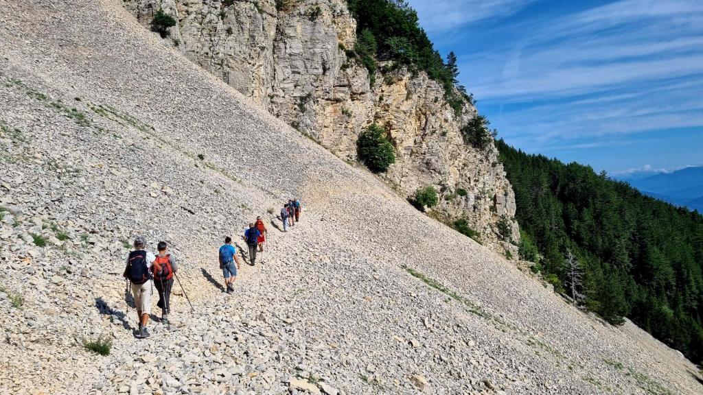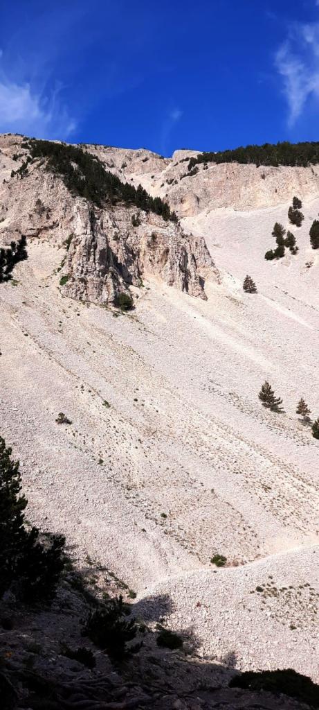 Ensuite il faut emprunter la descente dans des pierriers vertigineux, chamois et cabris. Et puis les fleurs… selon l’exposition : pavot arctique, raiponces bleues, ail rose, lis martagon, genévriers noirs, pins à crochets rabougris… Nature intégrale, Ventoux splendide ! Un géant de Provence.