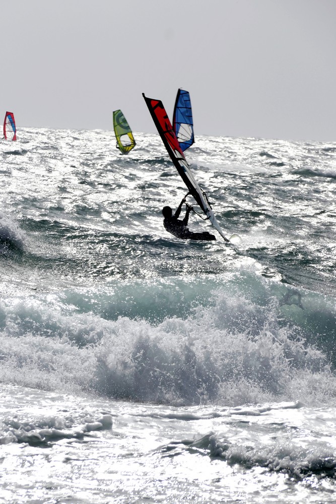 Troisième jour au bord d’une prévision changeante et découverte d’une côte très animée par des kite-surfers et planchistes puissants dans une « mer labourée ».