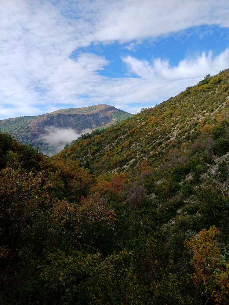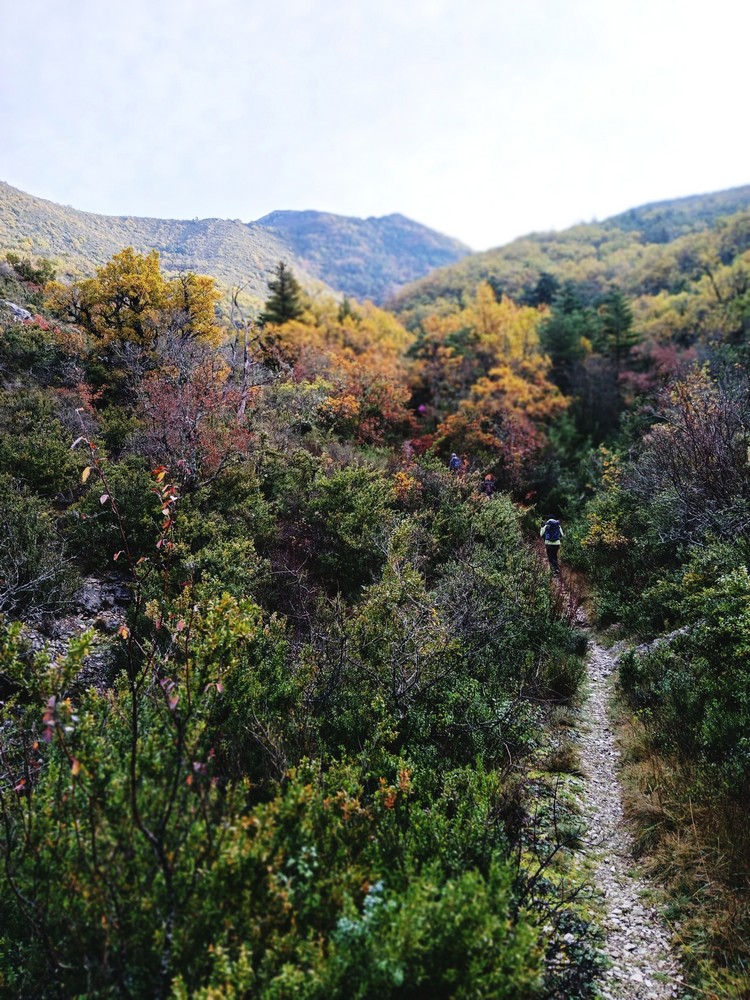 Bien équipés, nous commençons sur une piste qui rapidement se transforme en petit sentier assez pentu qui nous offre de belles couleurs automnales et nous réchauffe.