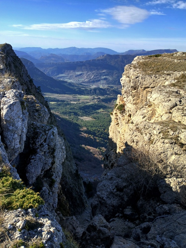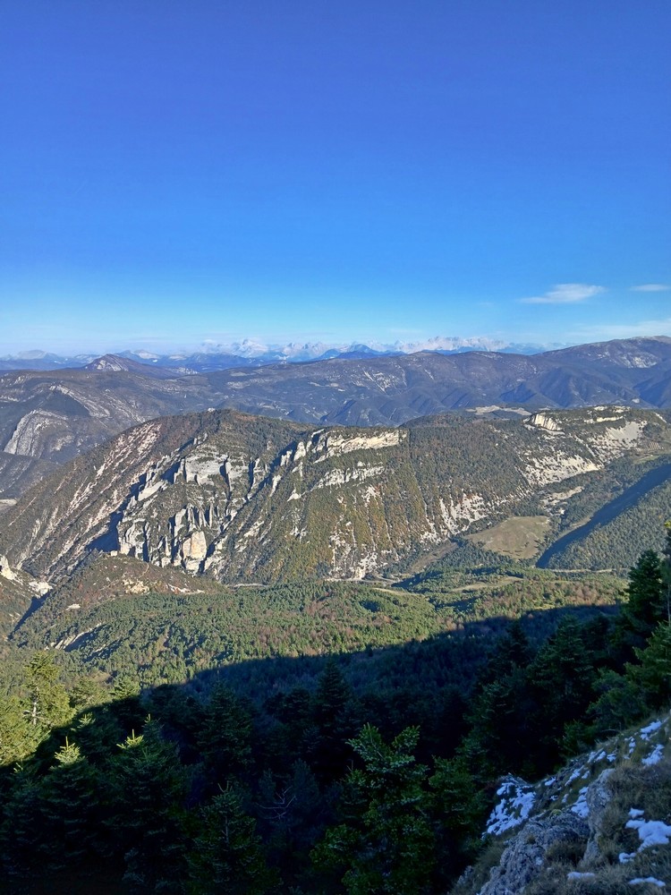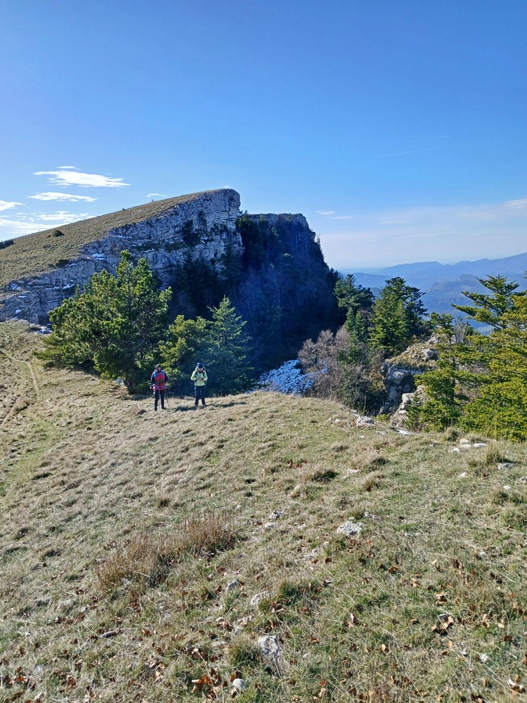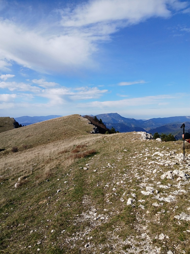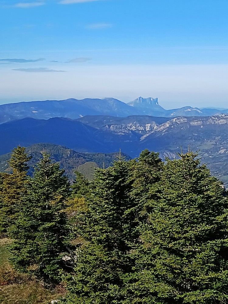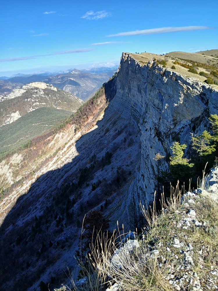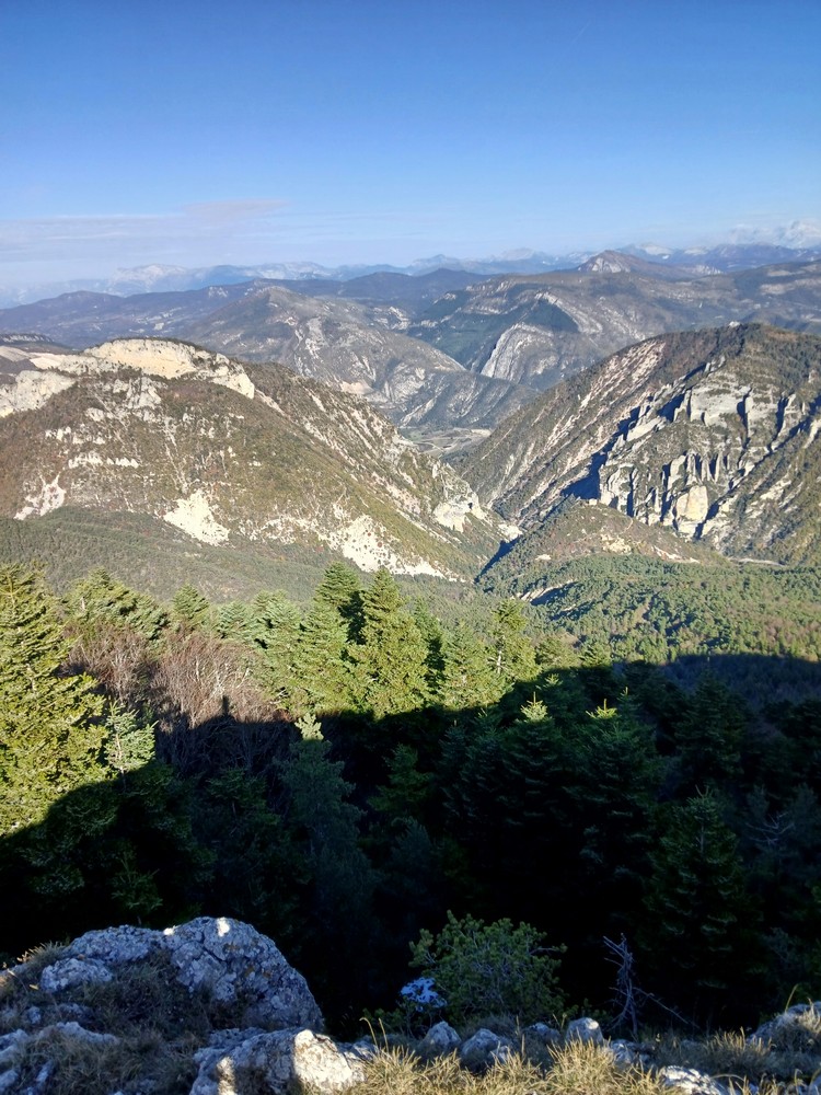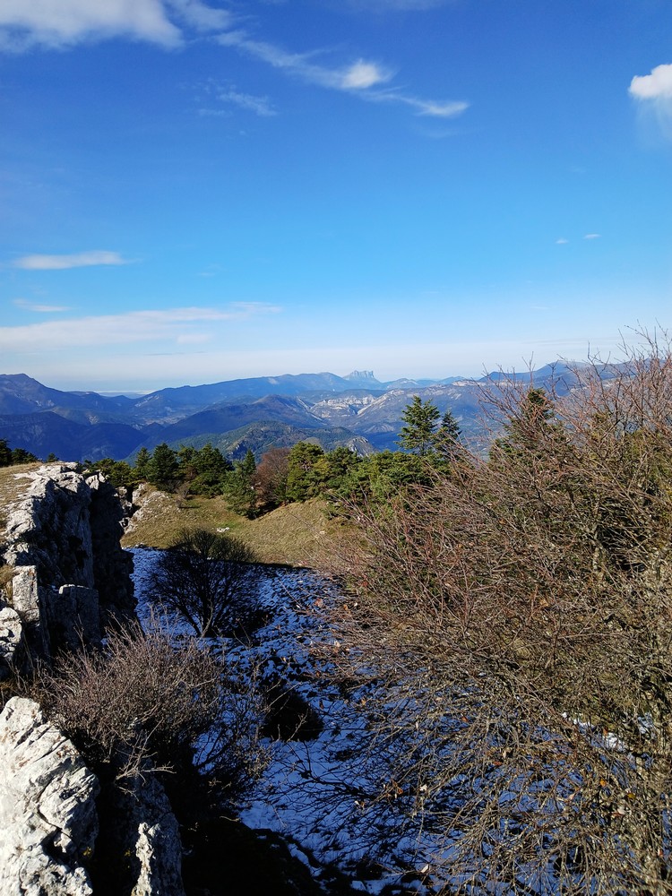 Limite entre l’Adret et l’Ubac, une fois de plus la vue impressionnante, nous fait remonter les souvenirs de précédentes escapades, nommant les sommets connus, échangeant nos connaissances sur les noms des sommets, les Alpes, le Glandasse, le Grand Veymont, les Trois Becs, Angèle, la Lance, Vanige, le Bonnet Rouge et, bien d’autres encore. Le petit vent frais nous ramène à la réalité : trouver un endroit abrité pour nous restaurer. Notre pause, un peu en contre bas des crêtes fut courte, le petit vent frais qui nous accompagnait depuis le matin, sort vainqueur sur le soleil qui essayait de nous réchauffer.