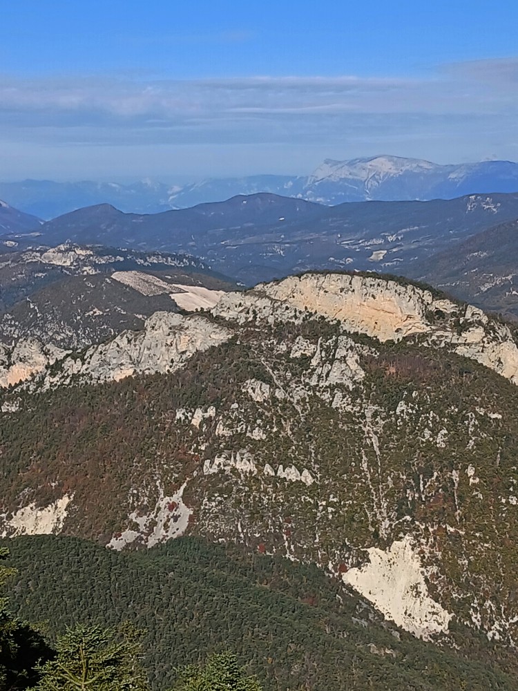 Par une piste forestière nous basculons du côté de l’Ubac. Là, changement radical, nous passons d’une végétation aride à une majestueuse foret de conifères et de hêtres, des arbres qui s’élèvent vers la lumière dans une lente course entre les feuillus et les résineux. Le sol est un tapis de feuilles et d’aiguilles mélangées bien agréable, mais qui ne nous rappelle à chaque pas l’inclinaison de la pente et nous invite à plusieurs pauses pour apprécier la sérénité du lieu, mais aussi pour rependre notre souffle et méditer la façon de franchir les falaises qui se dessinent au-dessus de nos têtes. Surprenant sentier qui après quelques escalades rocailleuses mais faciles, traversant des lambeaux neigeux, nous amène au sommet de la montagne de Raton 1473m